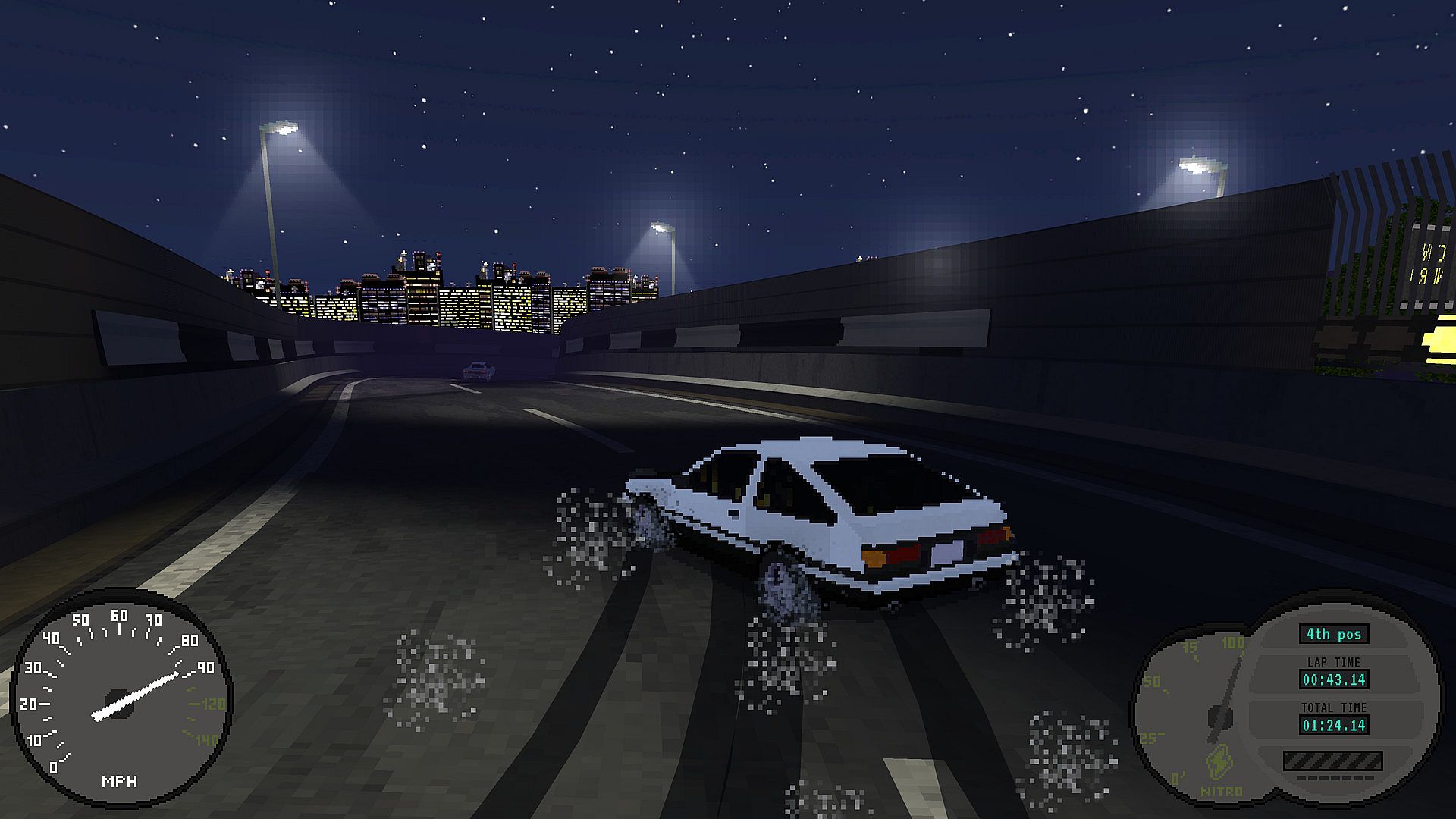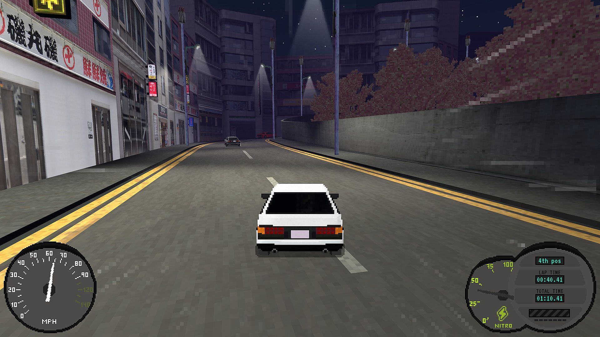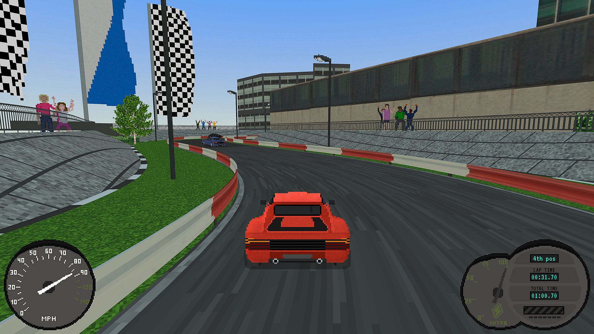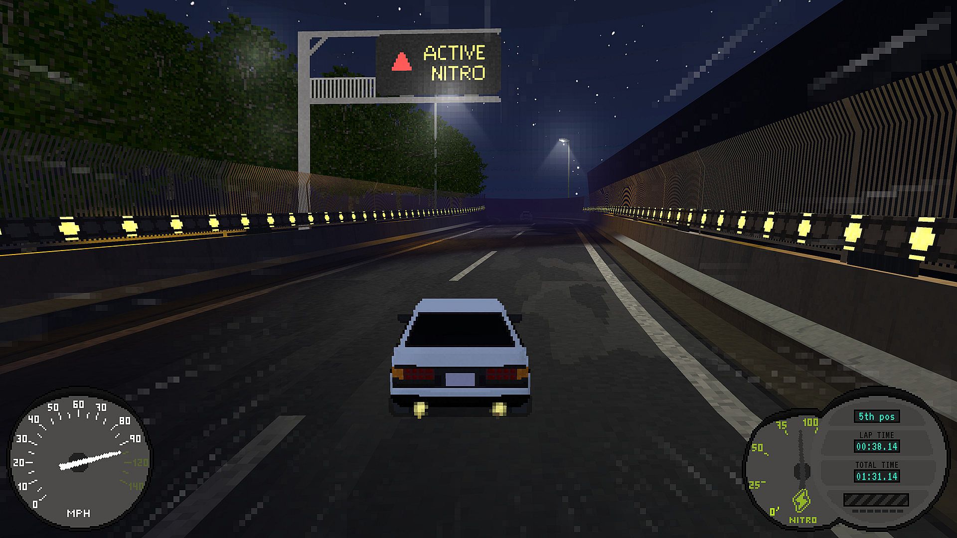 Nitro Back is a racing game that embraces a retro graphic style using current technologies, with the use of 3D low poly models and pixel art textures, combined with global illumination.