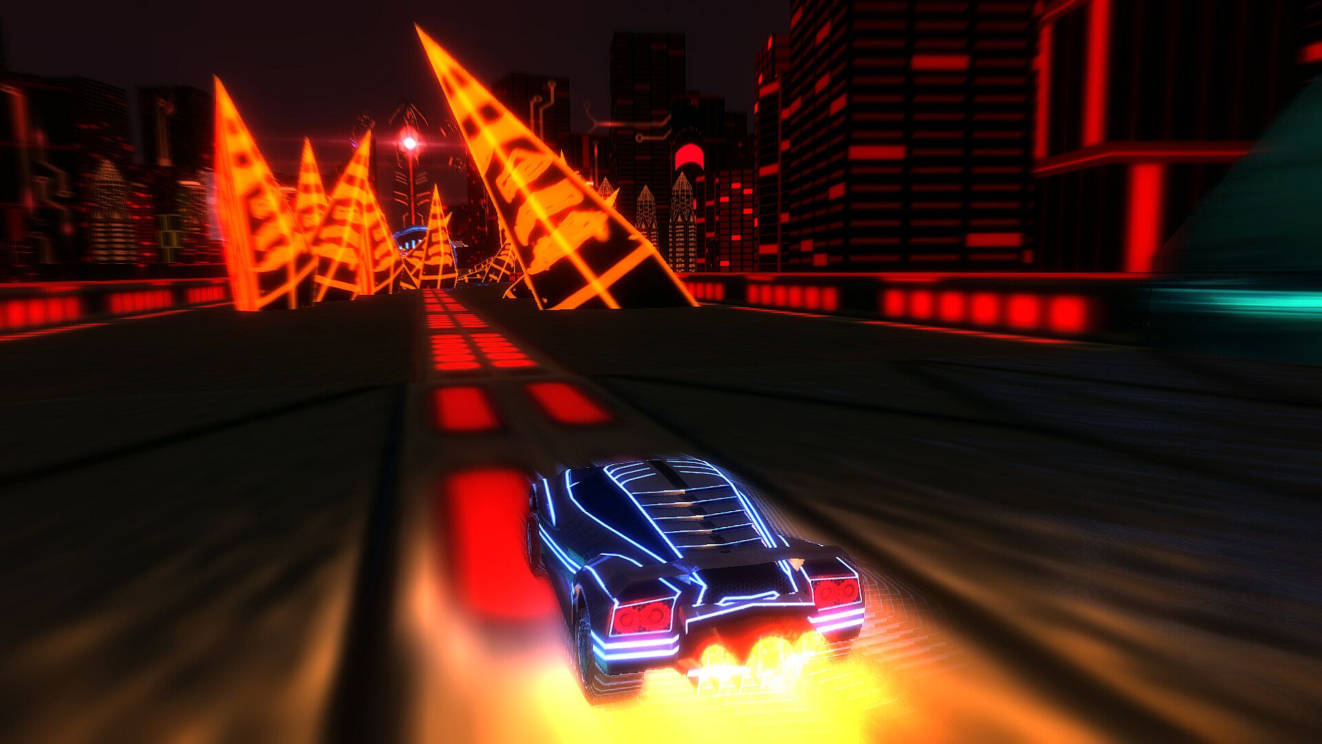 We were inspired by games like San Francisco Rush 2049 and Super Meat Boy, and media like Tron Legacy (hence this game's mash-up name). Inside you'll find a heavy focus on arcadey car behavior; surviving levels that want you to crash; pretty, glowy visuals; and music that reacts to your use of the car's abilities.