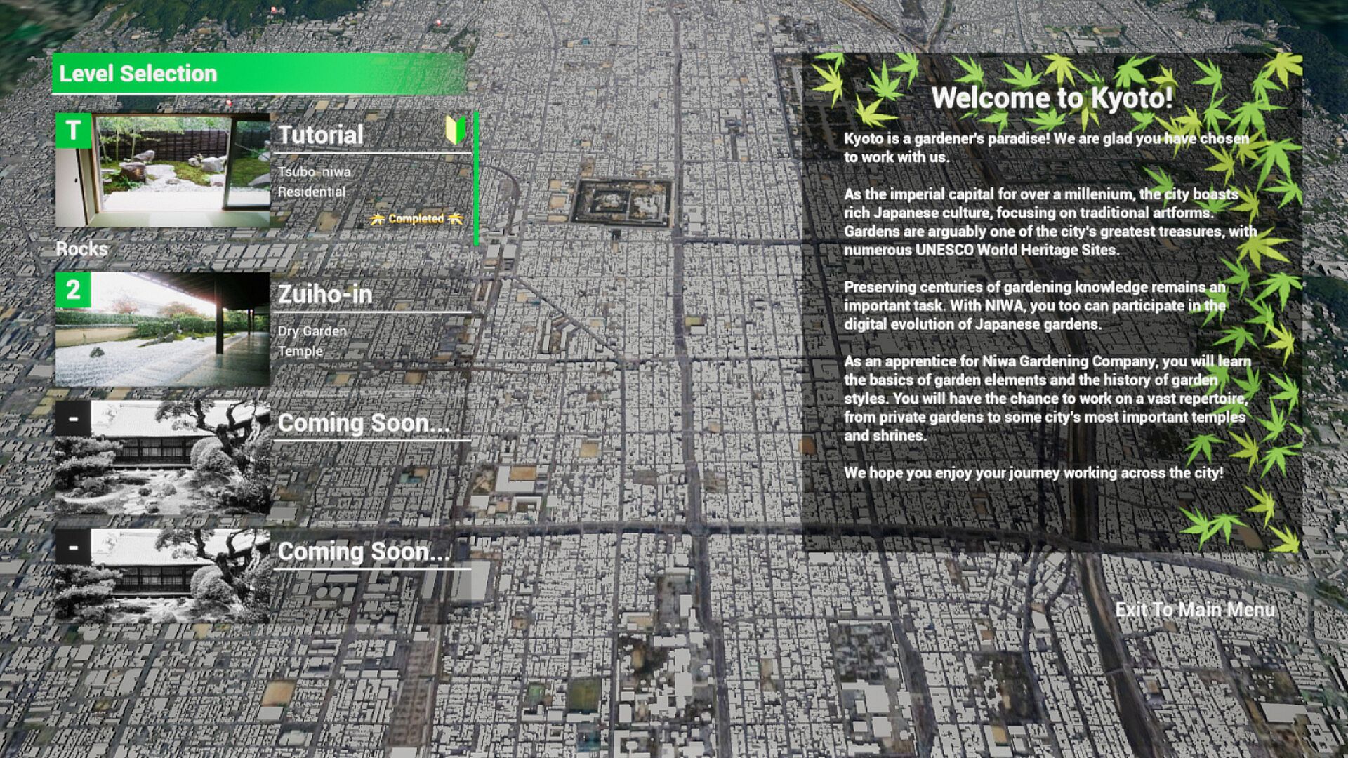 Niwa - Japanese Garden Simulator is a gardening simulator set in Kyoto, Japan, the birthplace of zen gardens. By playing Niwa - Japanese Garden Simulator you will learn authentic Japanese gardening techniques and how to apply them to realistic reproductions of historical locations in the city. You will learn the basic elements of traditional garden composition: stones, plants and water. Then use these techniques to create your own gardens.