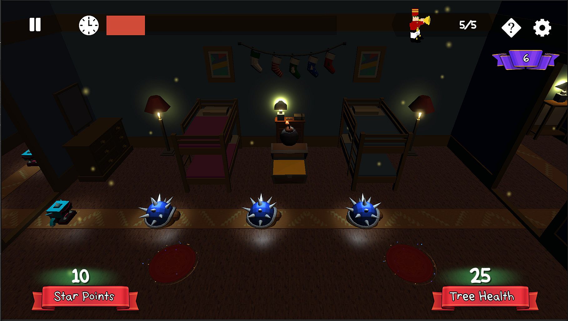 Crooks invade your house on a snowy Christmas Eve in this fast-paced tower defense game. Defend the Christmas tree by spending star points on towers placed across different rooms. Activate special abilities like the Bomb, Water Bucket, and Toilet to counter enemies stealing presents-unlock them as you advance. Flaming presents ignite if the tree suffers damage, dealing ongoing harm that ramps up with more active ones. Navigate ten levels with varied tower placement strategies, then test endurance in Survival Mode. Strategy fans enjoy the quirky holiday theme and room-switching controls via space bar and mouse clicks.