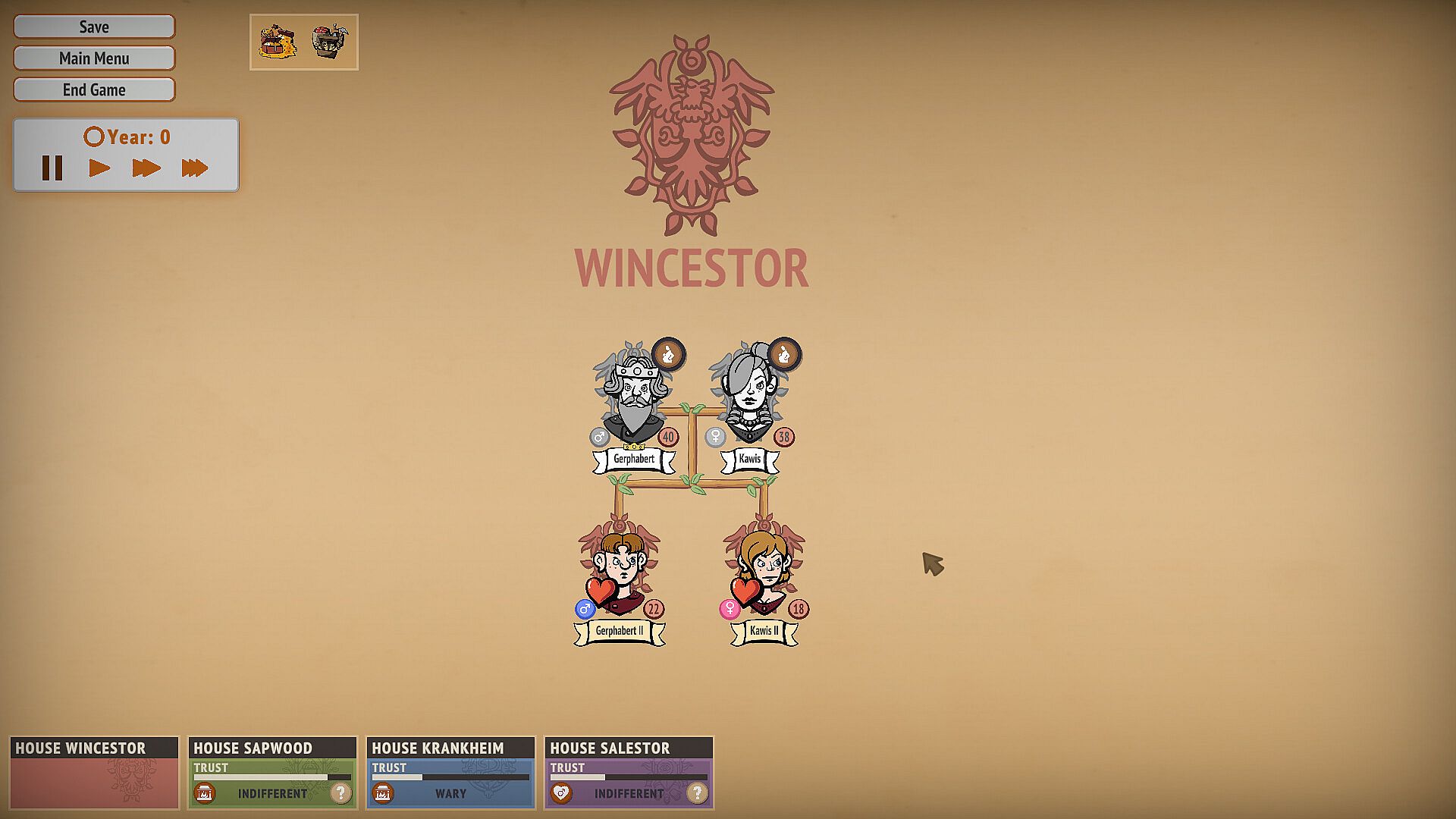 Play as one of the four houses and match your lords and ladies with the other houses. Each house has distinct starting genes with strengths and weaknesses.