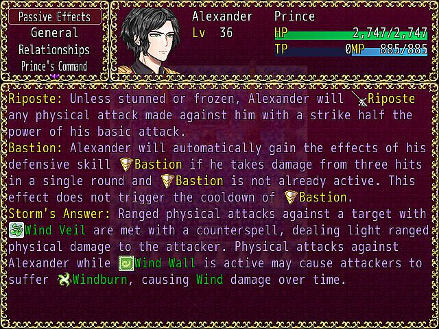 In Noblesse Oblige, every character is unique, with his or her own opinions, personality, and reasons for joining the party. Every party member has loyalty, driven by their opinions of choices made and paths taken; increasing loyalty unlocks powerful skill upgrades and extra story content for that character. In addition to their unique perspectives on the story, each of Alexander’s companions brings unique mechanics into battle. These include not only a wide variety of skills and playstyles, but also unique passive effects that shape how they approach combat. Combat in Noblesse Oblige is a novel take on the traditional turn-based RPG, one intended to promote skill and judicious use of abilities, rather than merely managing attrition or spamming generic attacks.