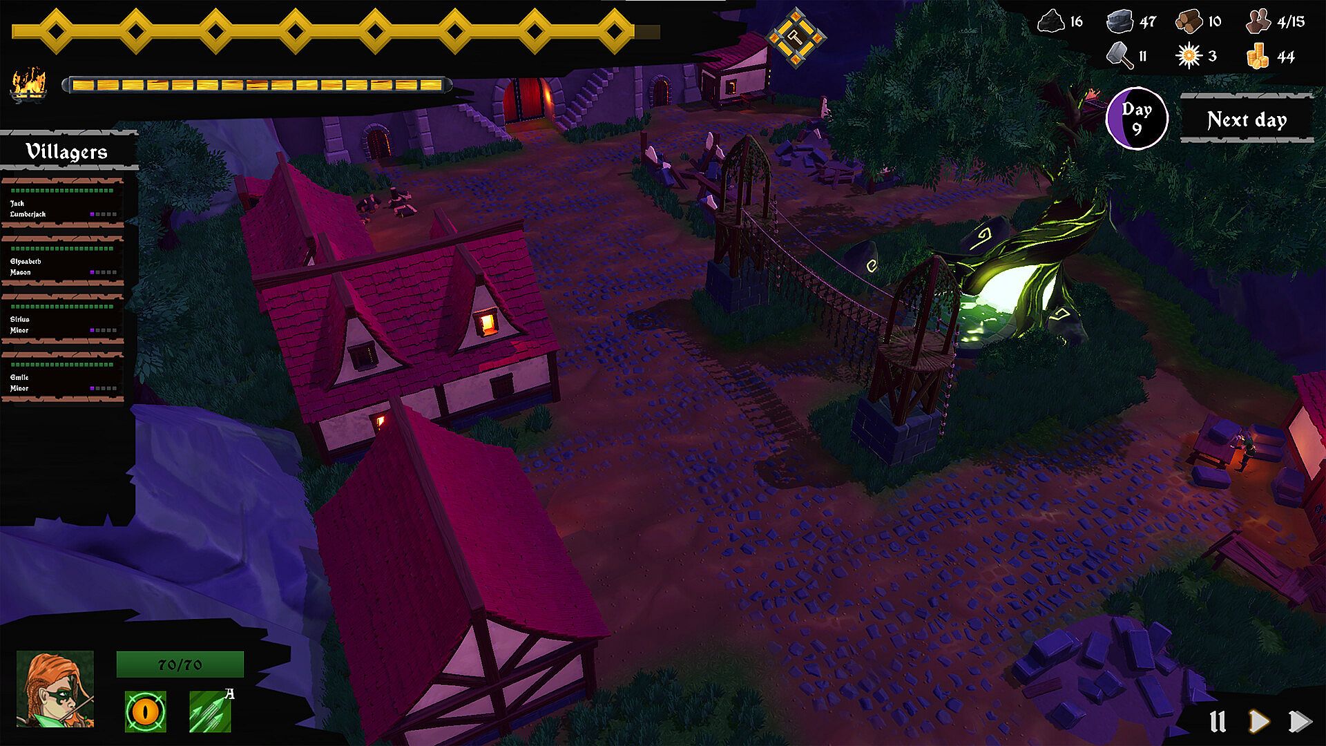 Darkness will be your greatest enemy. You'll have to make sure you have enough light to prevent your villagers from turning into hostile creatures, but you can exile one of your villagers if he becomes a danger. But will his missing be a good thing, or a bad thing?