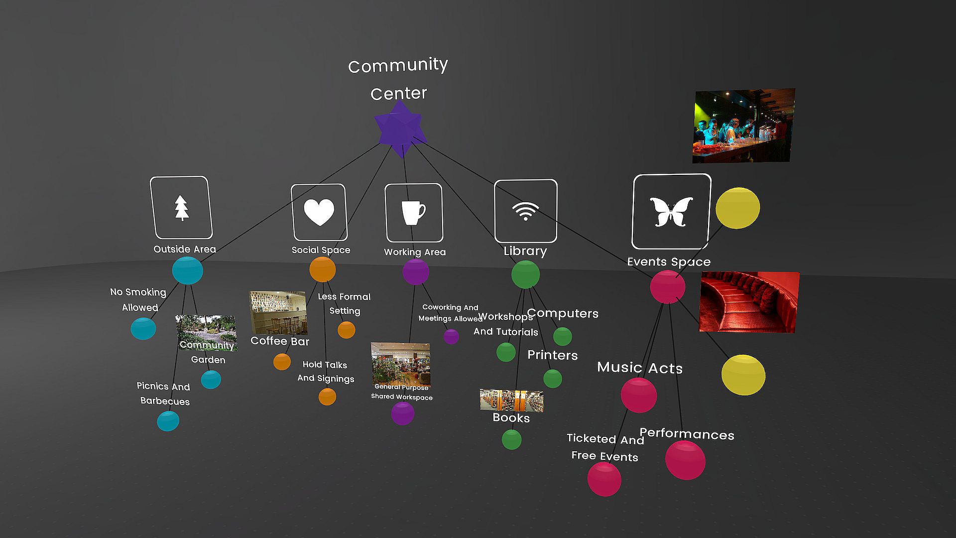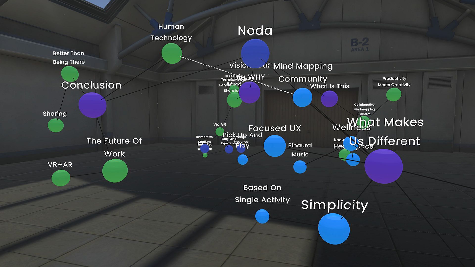 Our minds hold complex ideas connected in ways we cannot fully examine unaided. We often create symbolic representations of our thoughts – brainstorms, diagrams, mind-maps – but our ability to explore and represent them is limited by traditional 2D tools like whiteboards, mind-mapping software, and paper. We think and live in 3D and our thoughts are endlessly complex - no screen or wall can adequately capture or reflect them. Noda makes it possible. In Noda, your ideas take shape around you and can be mapped in limitless, multidimensional space, giving you more room to think and associate ideas. Your body’s natural abilities - movement and voice – enhance and ease the process of building conceptual structures. If traditional concept mapping tools are like architectural plans, Noda is an actual house.