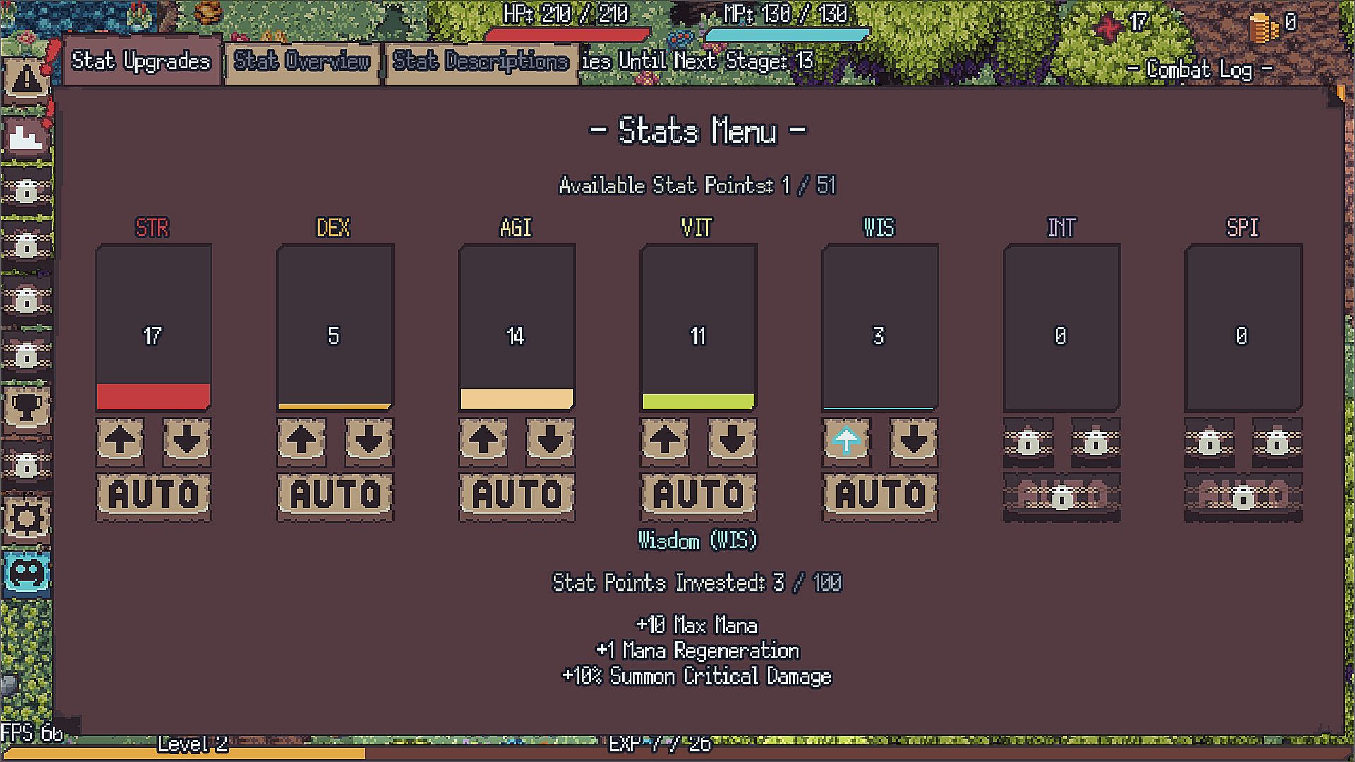 • Level up and earn Stat Points which may be distributed within 7 unique Stats, allowing you to create a build.
