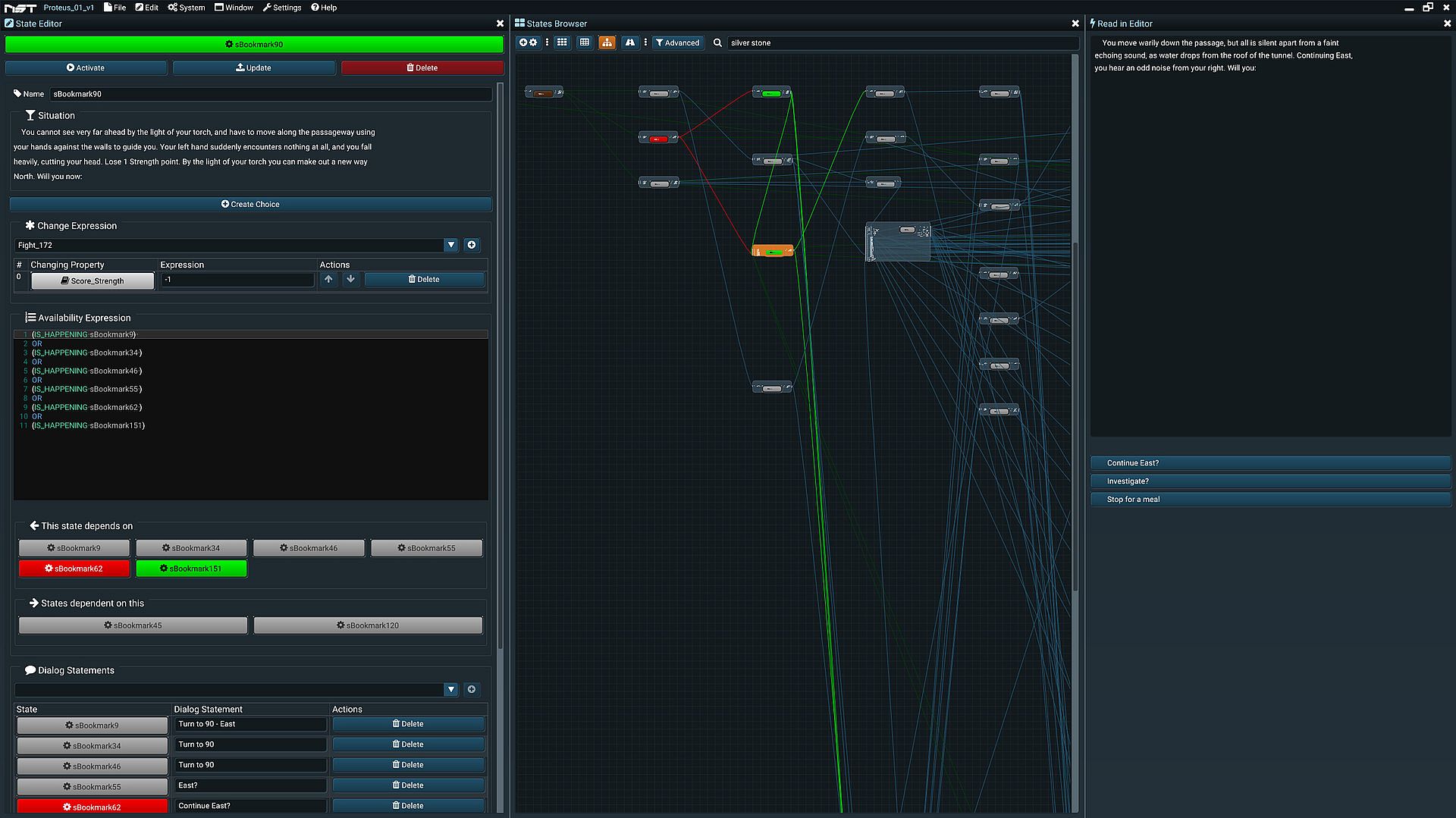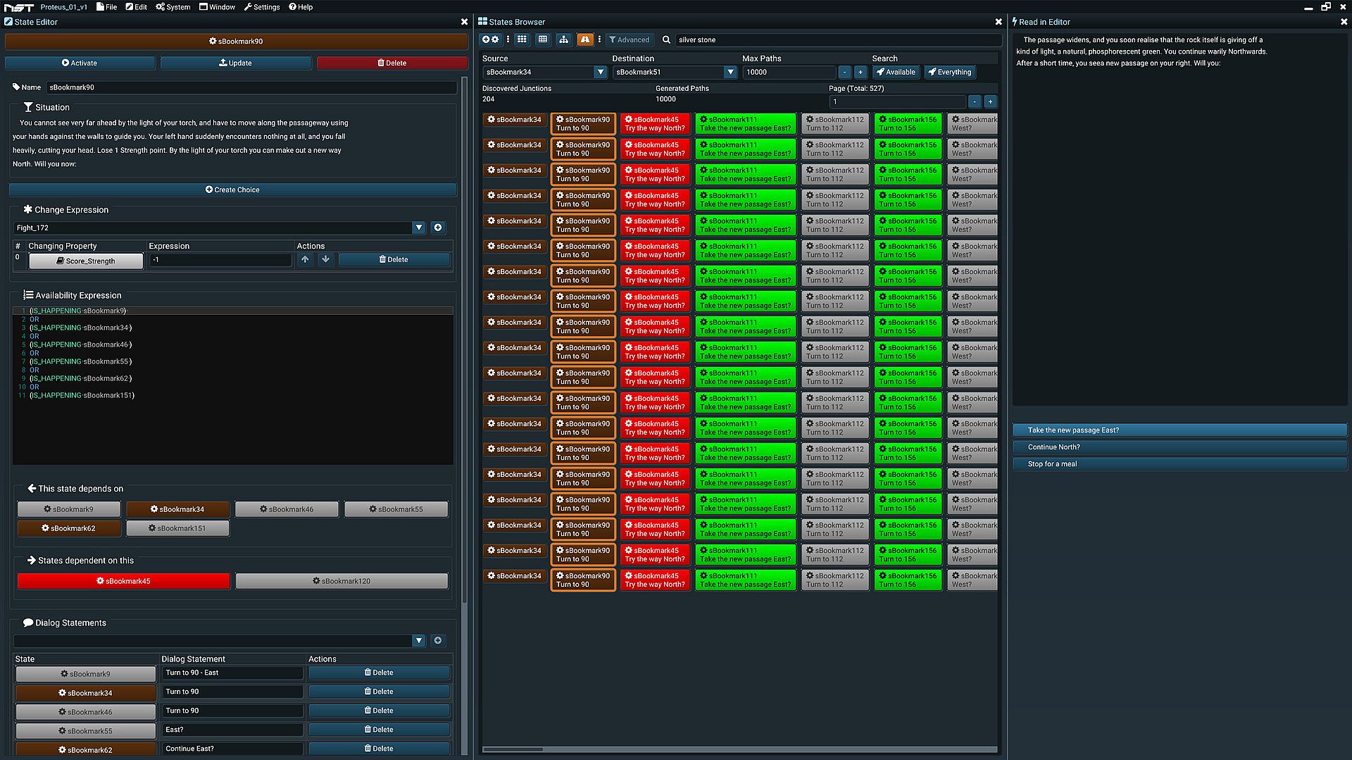NST has an Editor and a Reader. The NST Editor is a standalone program that enables you to write branching stories from scratch. The NST Reader is a tool that visually renders these stories using HTML/JavaScript/CSS with all their power. The Reader is available for free and also comes bundled with the editor.