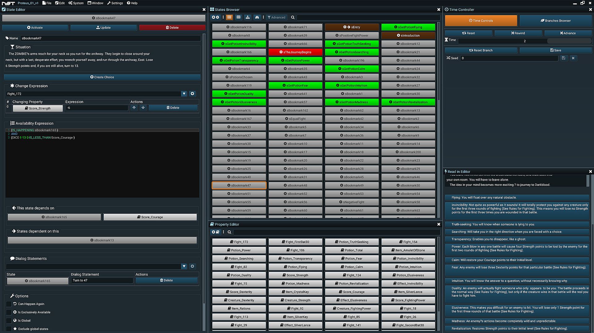 The states and properties are interconnected to form a story, which one can read in a branching fashion based on own's decisions.