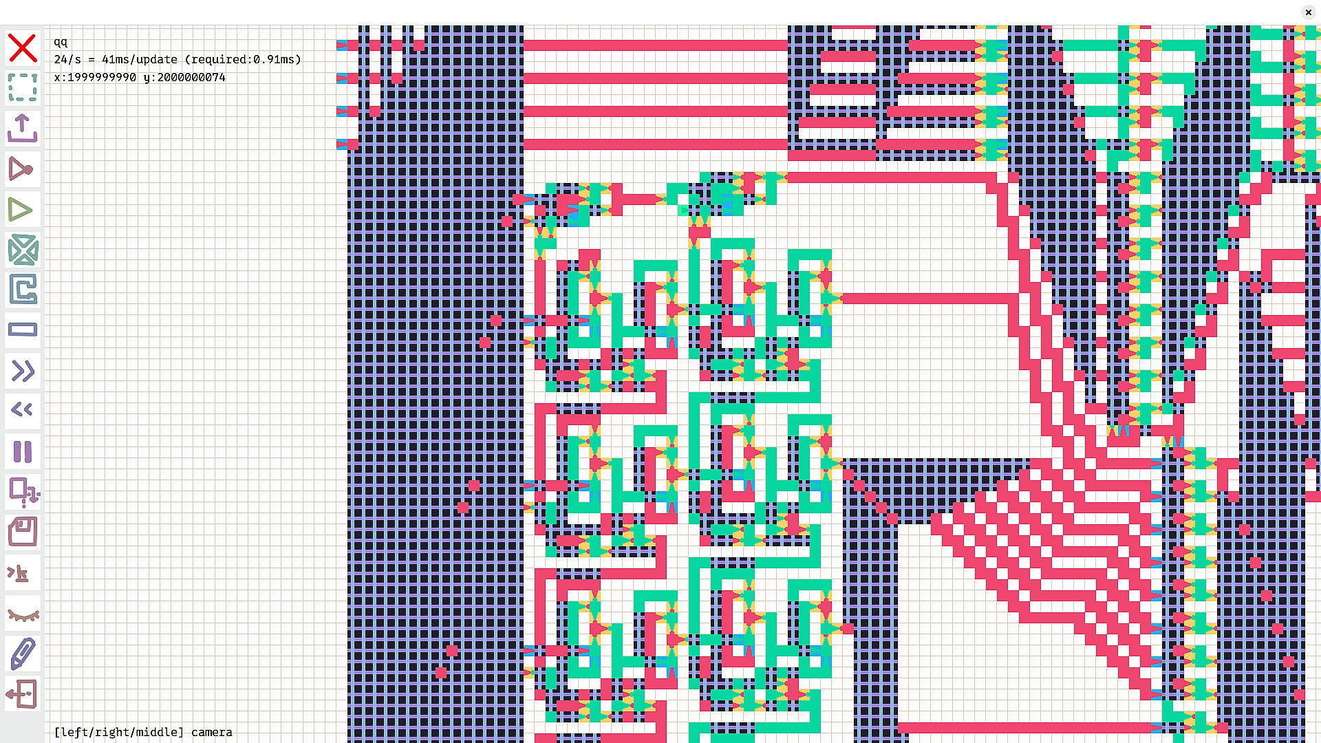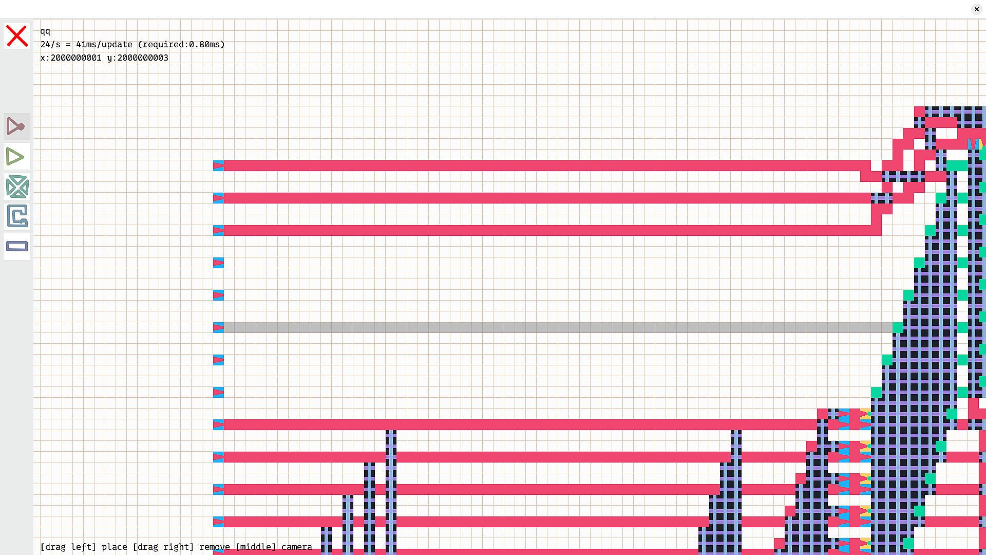 Taking computer redstone to the next level with 24bit color screens, keyboard inputs, powerful tools like copy pasting, saving blueprints, modifying simulation speed and more, all ready to be used. All of this with very few gates: NOT gate, wire (acts like redstone, so an OR gate), diode, ON and junctions. This was decided both as a challenge and to keep it simple.