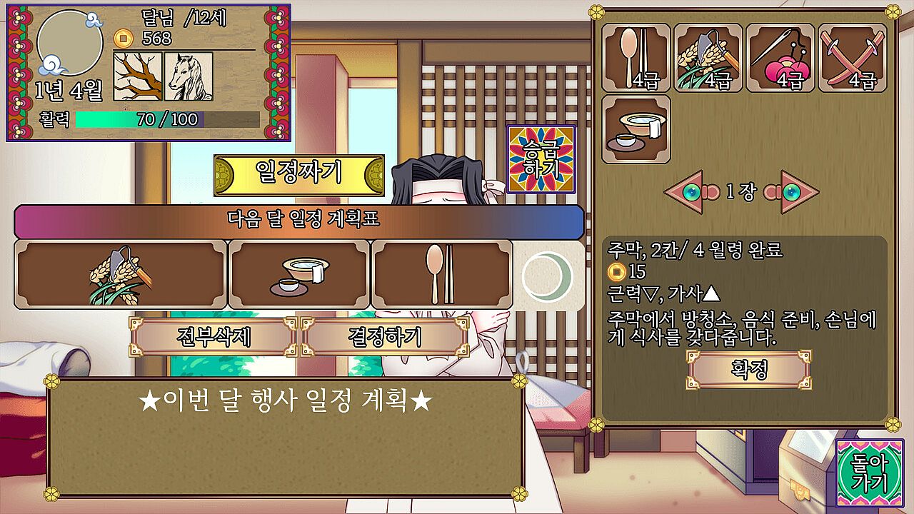15개 가량의 일정을 매 달마다 맞춰 돌려줍니다. 일손이 능숙해지면 승급을 시킨 뒤, 급료를 올려받으며 경험을 쌓아줍시다. - 생활관리는 필수!