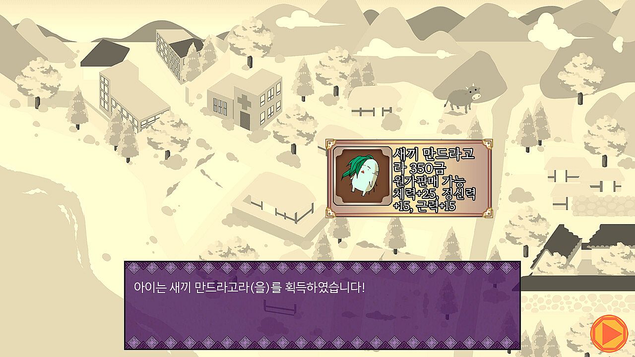 마실을 다니면서 아이의 소문을 듣거나 일손을 구해보세요. 돈을 조금 들인다면 유학을 갔다올 수도 있겠지요. 또한 산과 바다, 강가를 돌아다니며 사람들과 사교의 장을 만들거나 장작을 패거나 삼을 캐는 등의 생존활동도 가능! 돌연 나타나는 짐승을 사냥하거나 싸워야 하는 적이 있다면 전투도 가능하겠지요. - 친구들과의 우정