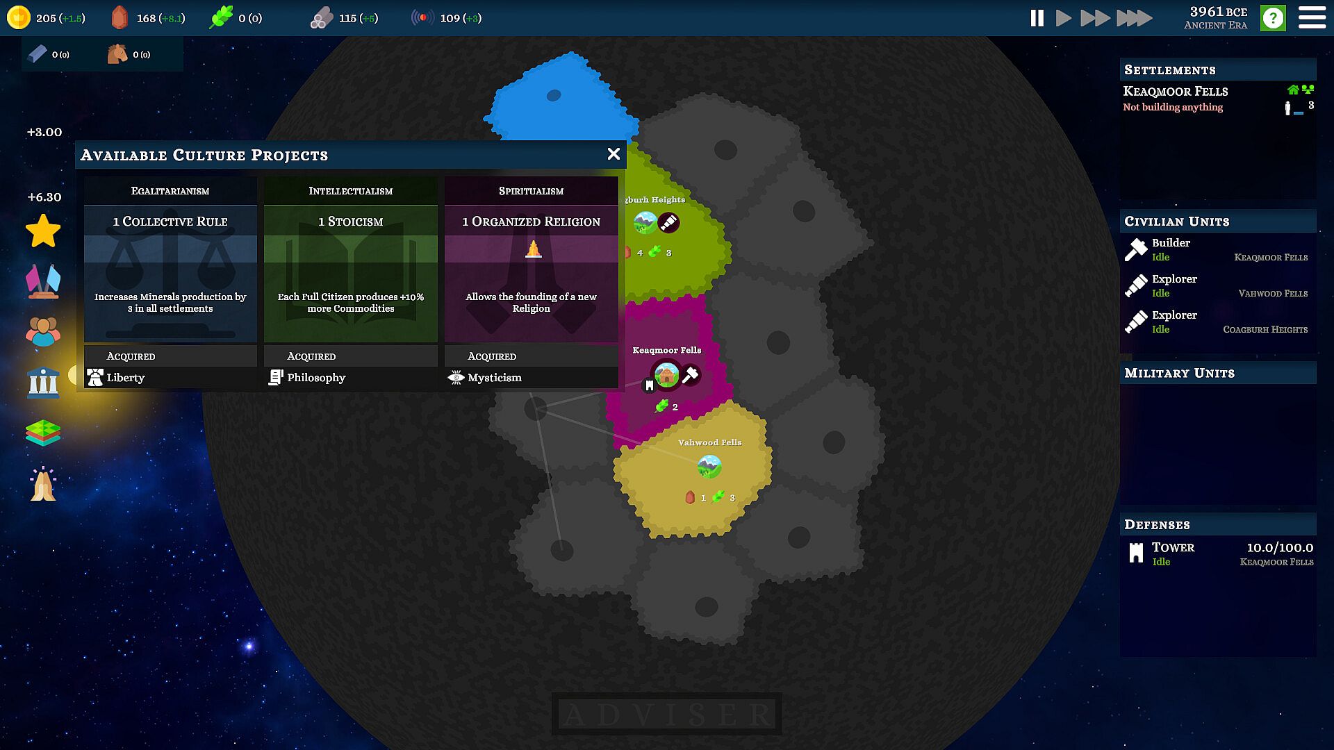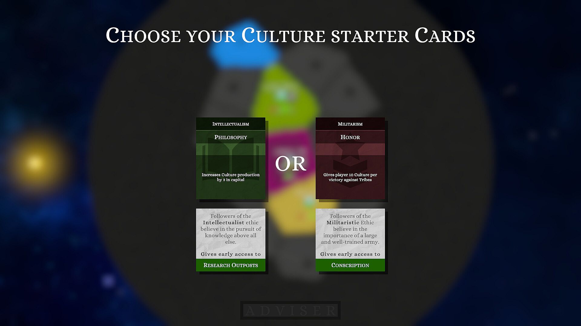 Ethics are the guiding principles by which your empire acts and grows. Your ethics control how you are able to treat your population, as well as how you interact with other civilizations and tribes.Select Culture cards based on your Ethics, which increase your productivity, and give you access to more powerful forms of governments.