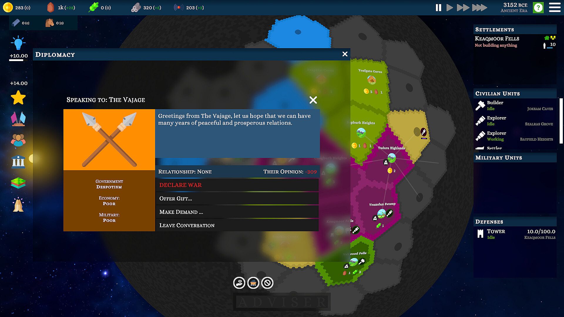 Alongside other major Civilizations, you will also interact with less developed Tribes. They can be either friendly or aggressive towards you, depending on their personality.