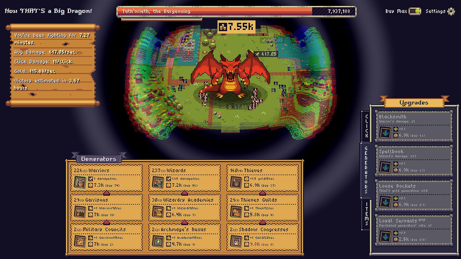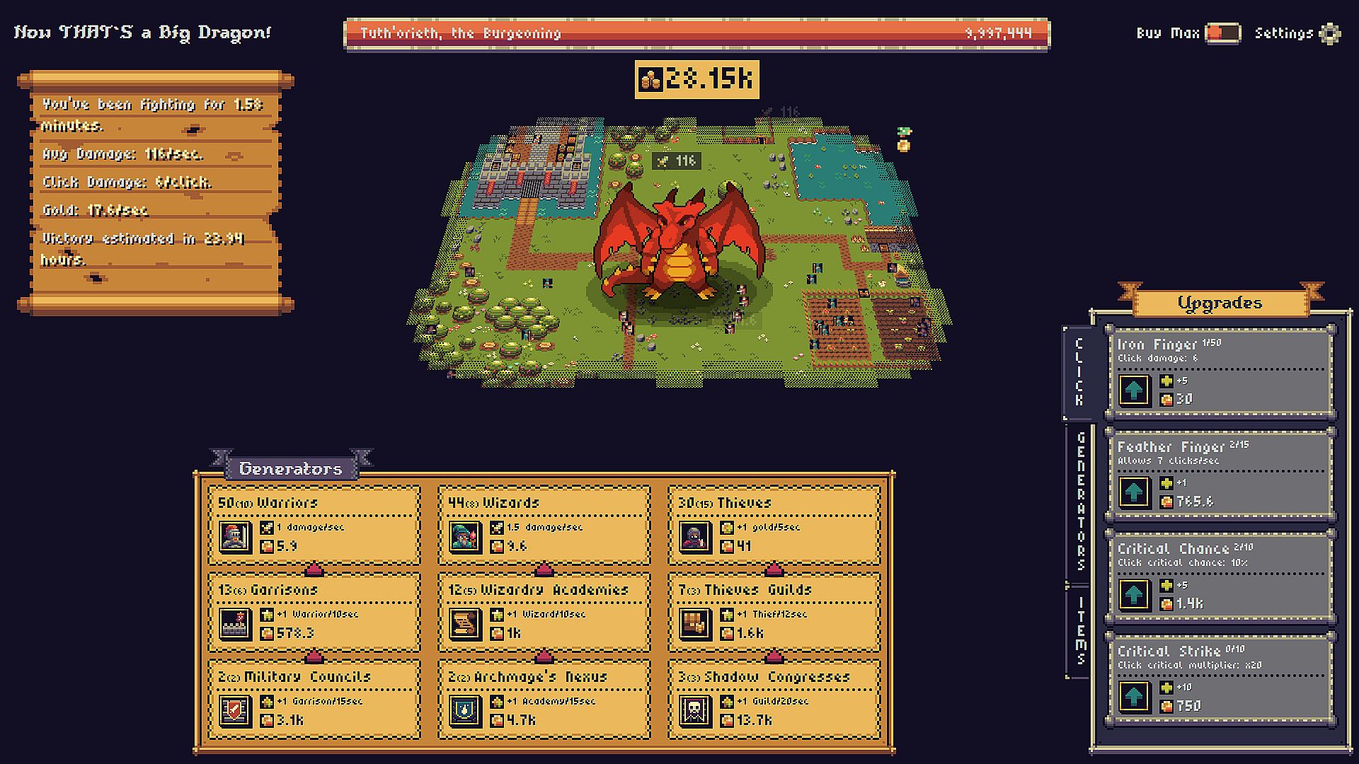 Your home kingdom is in danger, and it's up to you to recruit and expand an ever-growing band of brave warriors, wizards, and all sorts of adventurers who relentlessly attack a single, gigantic dragon. The game is a numbers-driven idle experience: buy more troops, upgrade their power, automate your economy, and click the dragon yourself for bonus damage.