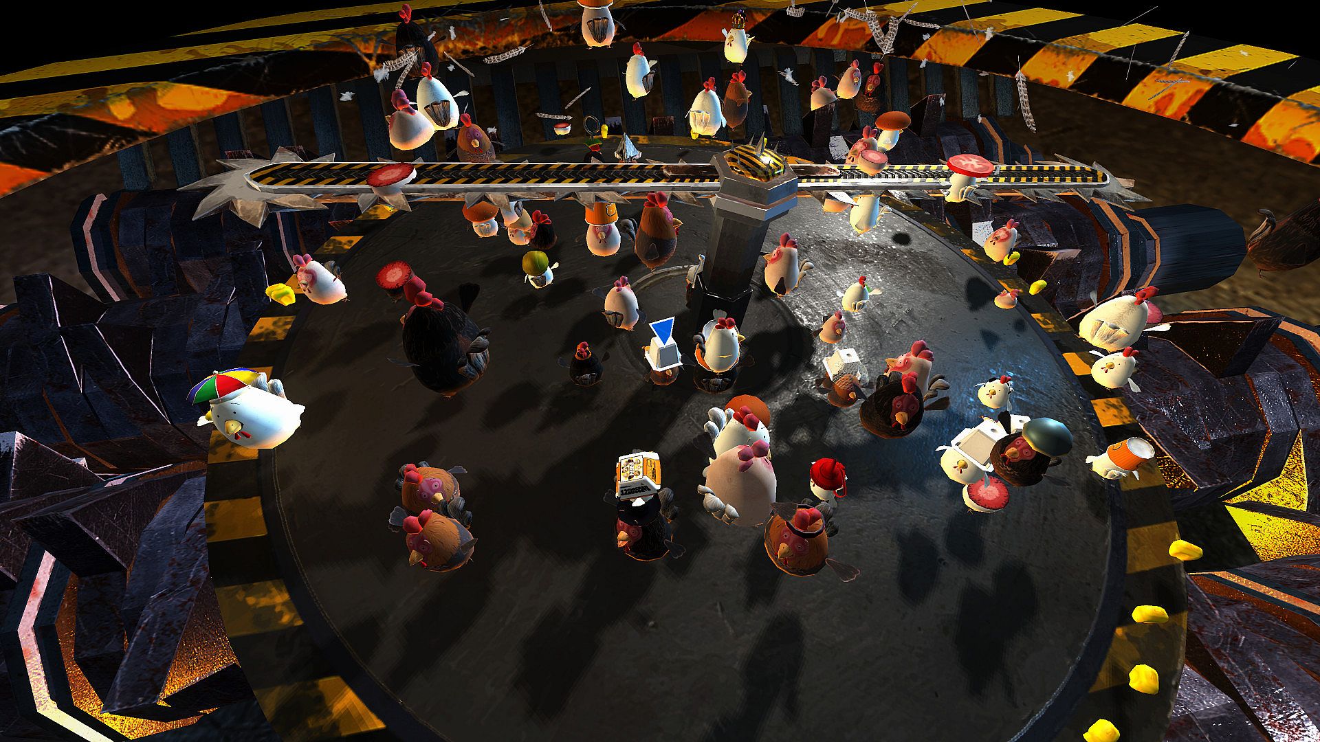 Chickens clash in a multiplayer battle royale on an unstable disk hovering over a grinder in a factory farm. Eighty players fight to stay on the platform as the last one standing avoids nugget fate. Grab time-limited boosts to freeze rivals into ice cubes, blast them with tornadoes, or fly to safety amid obstacles like slippery floors, growth pills for sumo pushes, and dodging saws. Over 14 stages across four themes challenge balance and quick reflexes, with holes appearing or frozen surfaces for shoving foes off. Unlock more than 40 hats through round wins or collected nuggets, from visor caps to deep fry baskets, and flaunt them in chaotic global matches or local play for up to four on one PC. Casual players and leaderboard chasers dive into these fast-paced, unpredictable brawls.