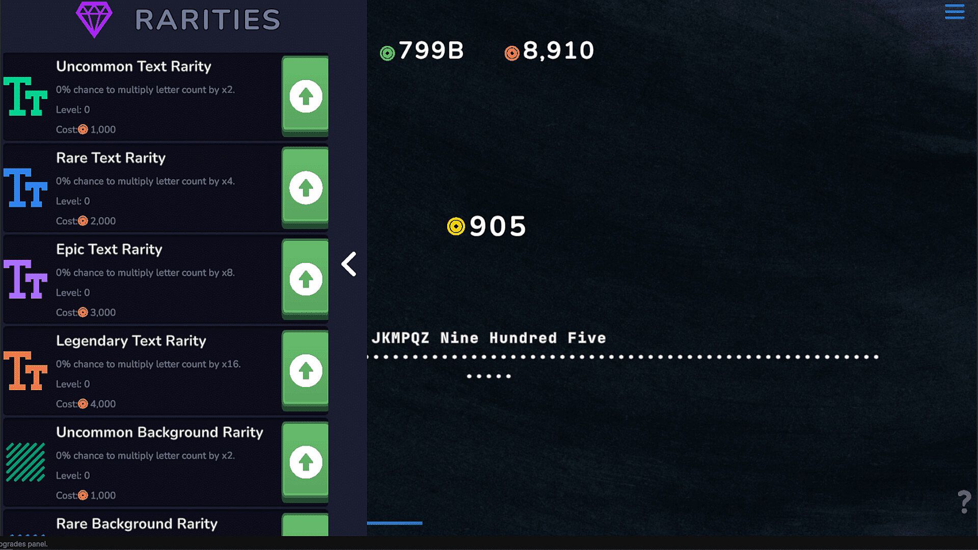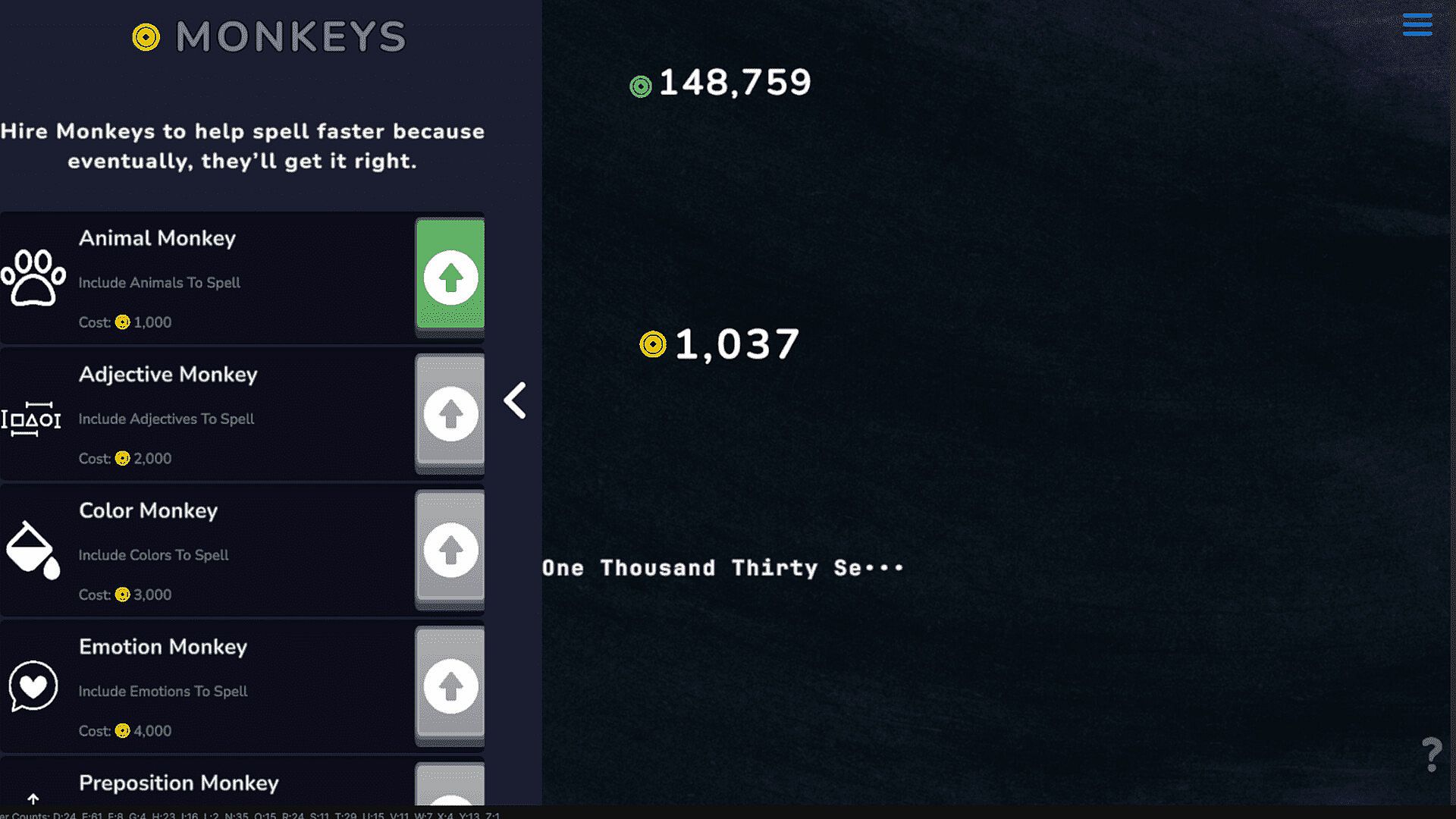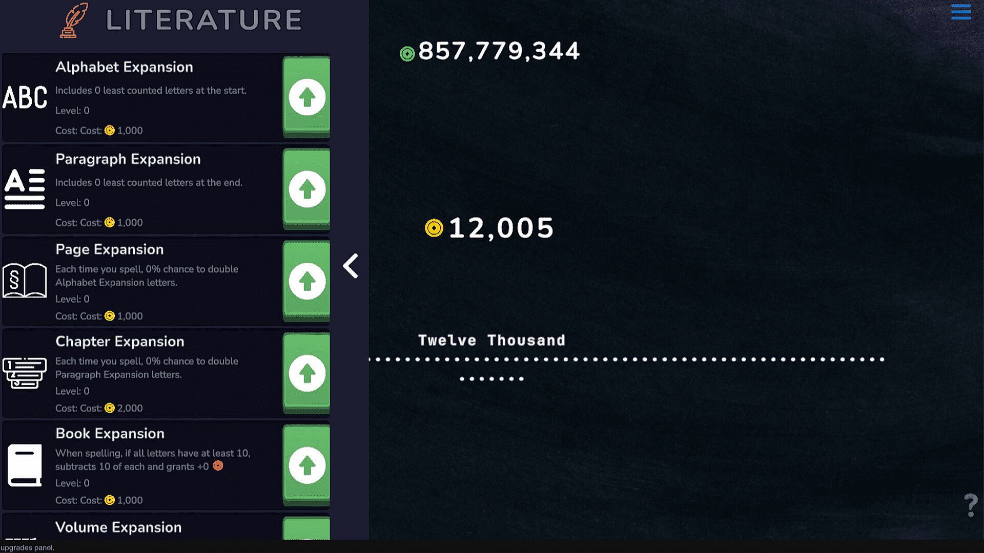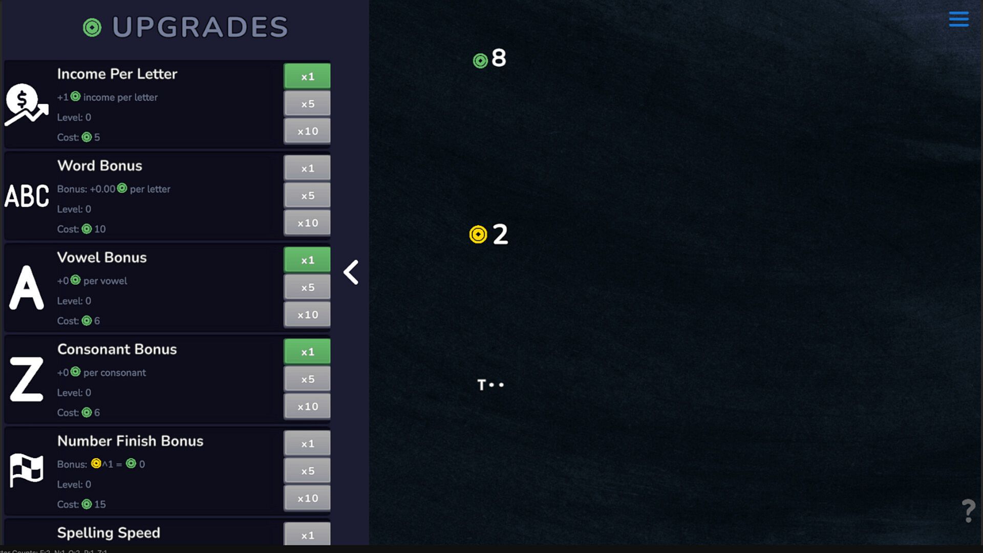Invest in upgrades like Income Per Letter, Spelling Speed, Number Finish Bonus, and more to multiply your earnings.