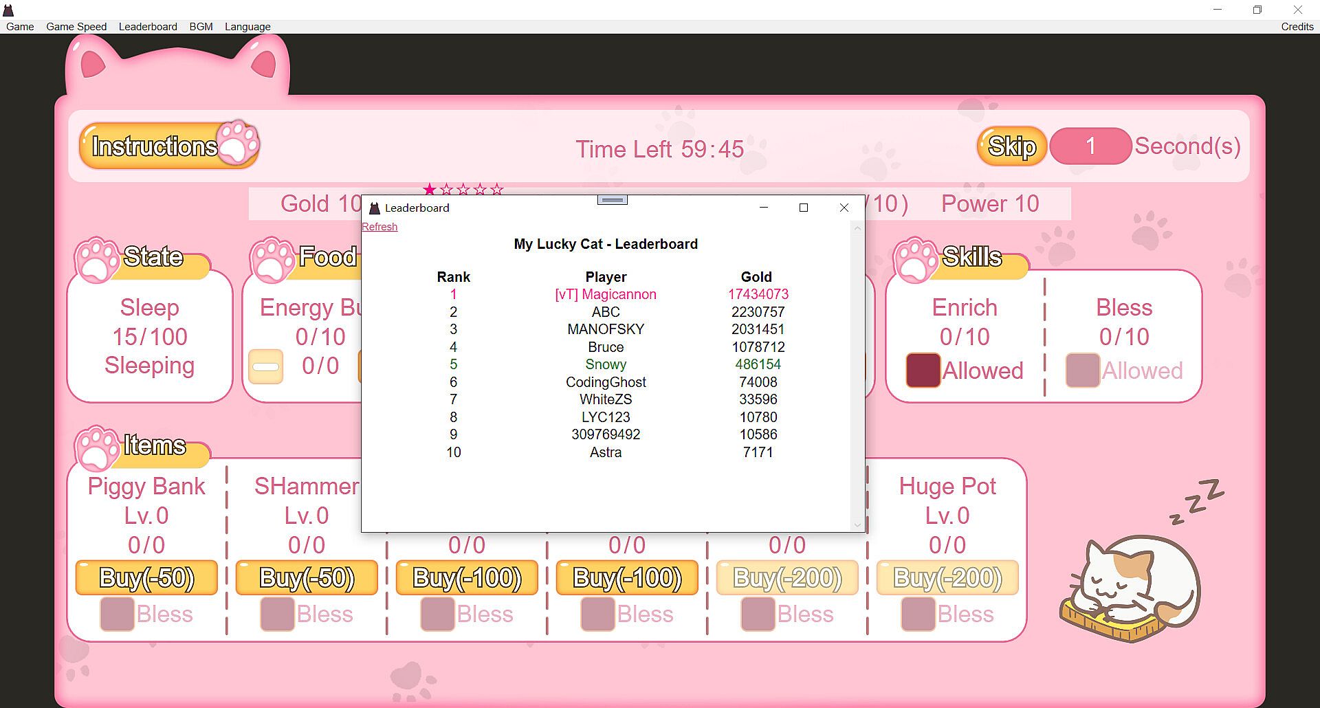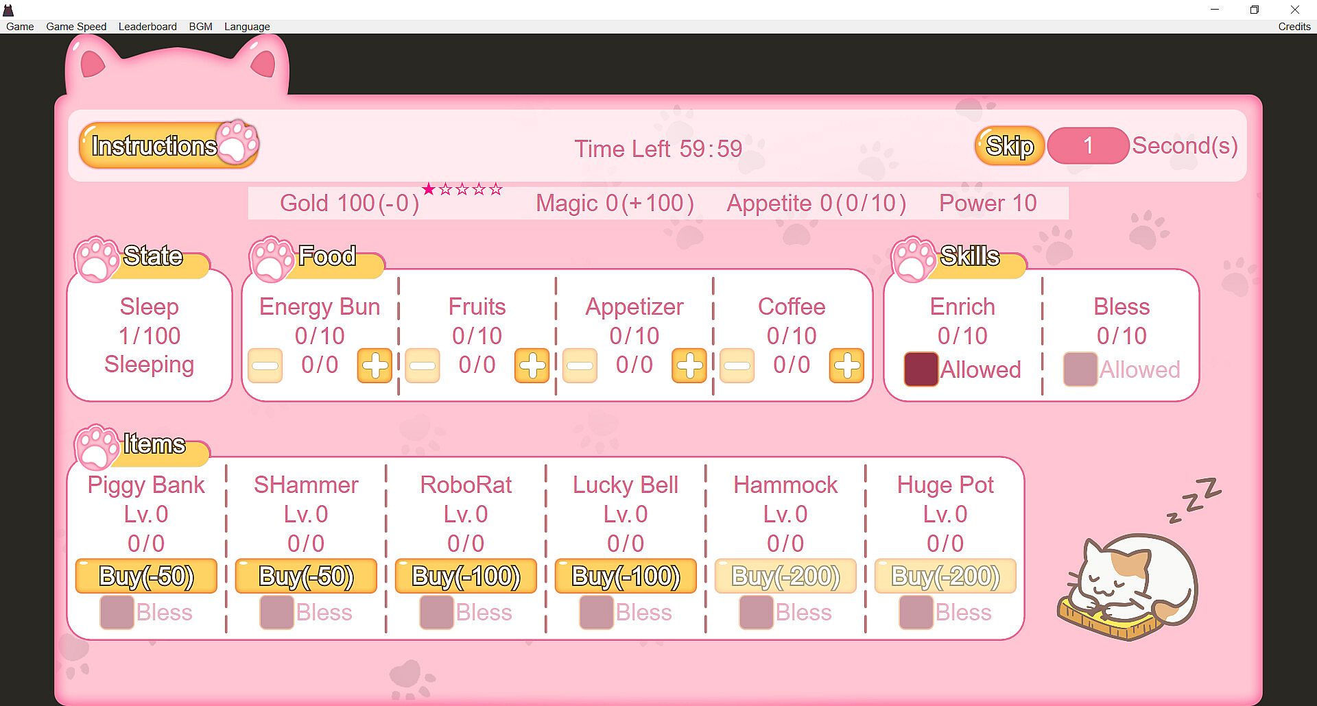 You have a lucky cat at your home. You can cook food, buy and upgrade items. Try to have the most gold possible. 5-star achievement requires 1 million gold.