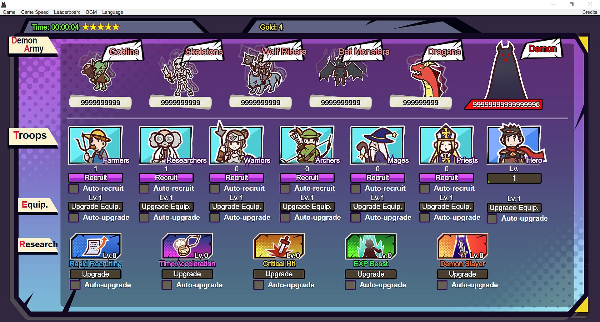Recruit and upgrade your troops and try to eliminate the demon army in the shortest time possible. Boss has 99999999999999999 HP.