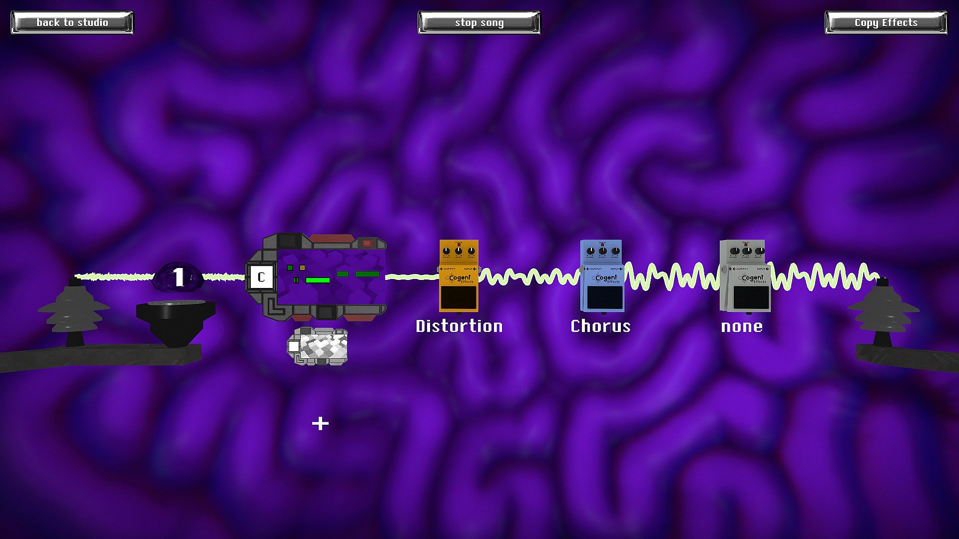 To do so, you hook up microchips that send and receive signals the same way that neurons do. Each chip has a threshold. If it receives enough stimulation from other chips to reach threshold it will fire and play a note. To solve the puzzle you must hook up the right notes and inhibit the wrong notes. Each puzzle is a phrase in the song the player is assembling. Complete all the puzzles so the band can play the song!