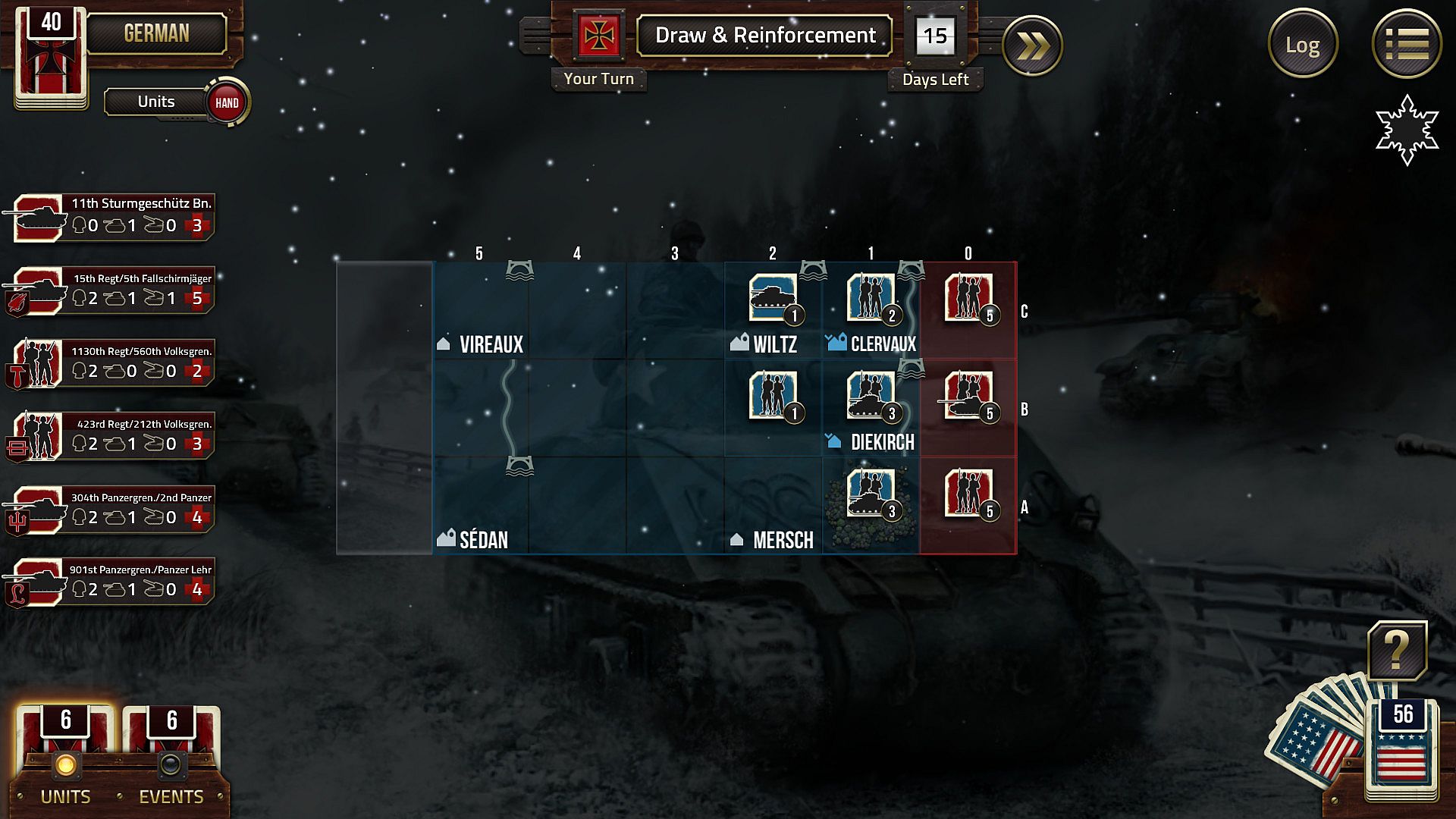 In the game you control either the German or the U.S. and British forces. You play using cards that represent the brigades, regiments and battalions which fought in the battle. Each unit is rated for it’s strength in infantry, armor, artillery and cohesion. You move and fight with the combat cards to eliminate the opponent’s cards and achieve or thwart a strategic breakthrough.