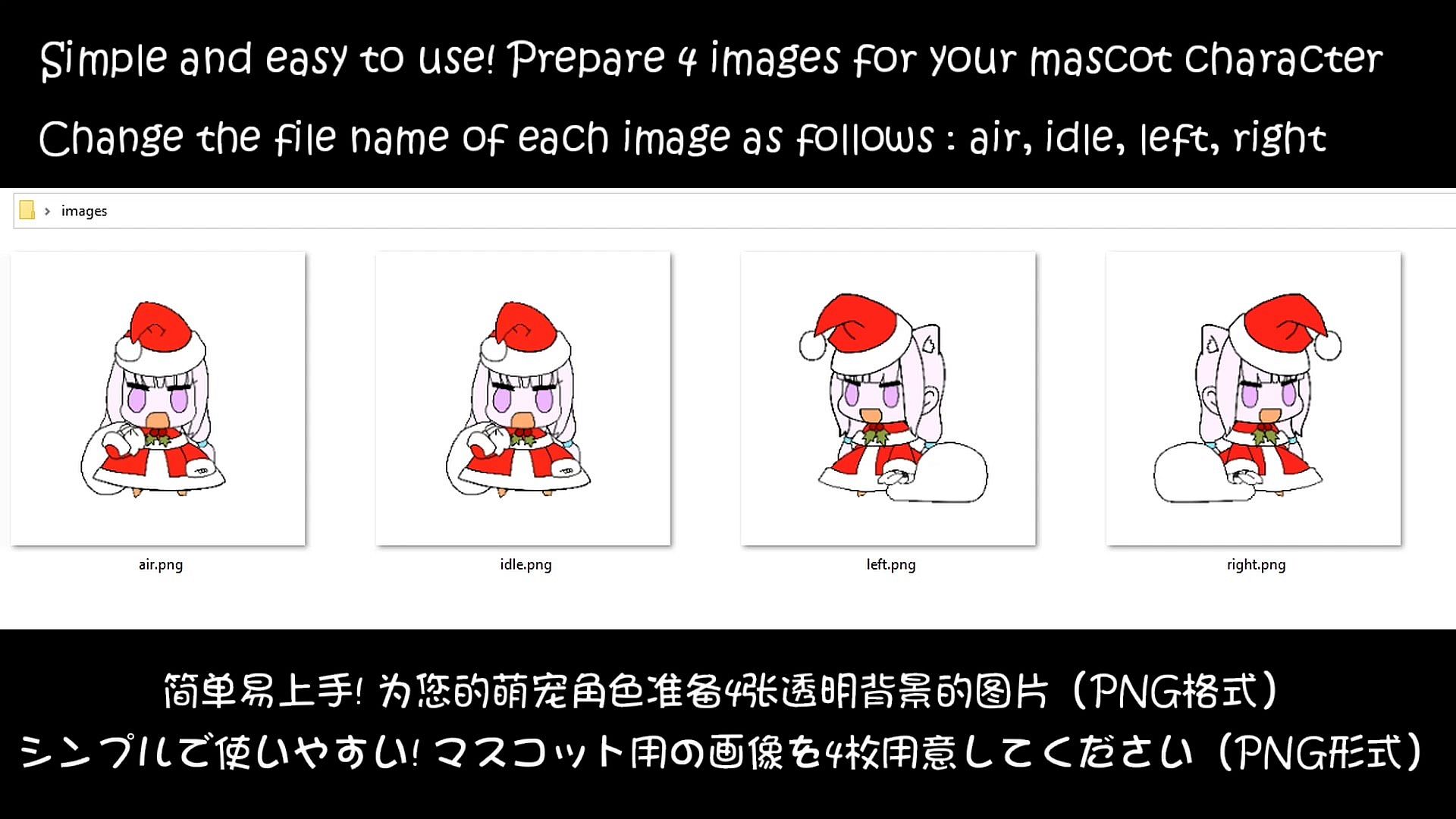 - Prepare 4 images for your mascot character with a transparent background (PNG format)