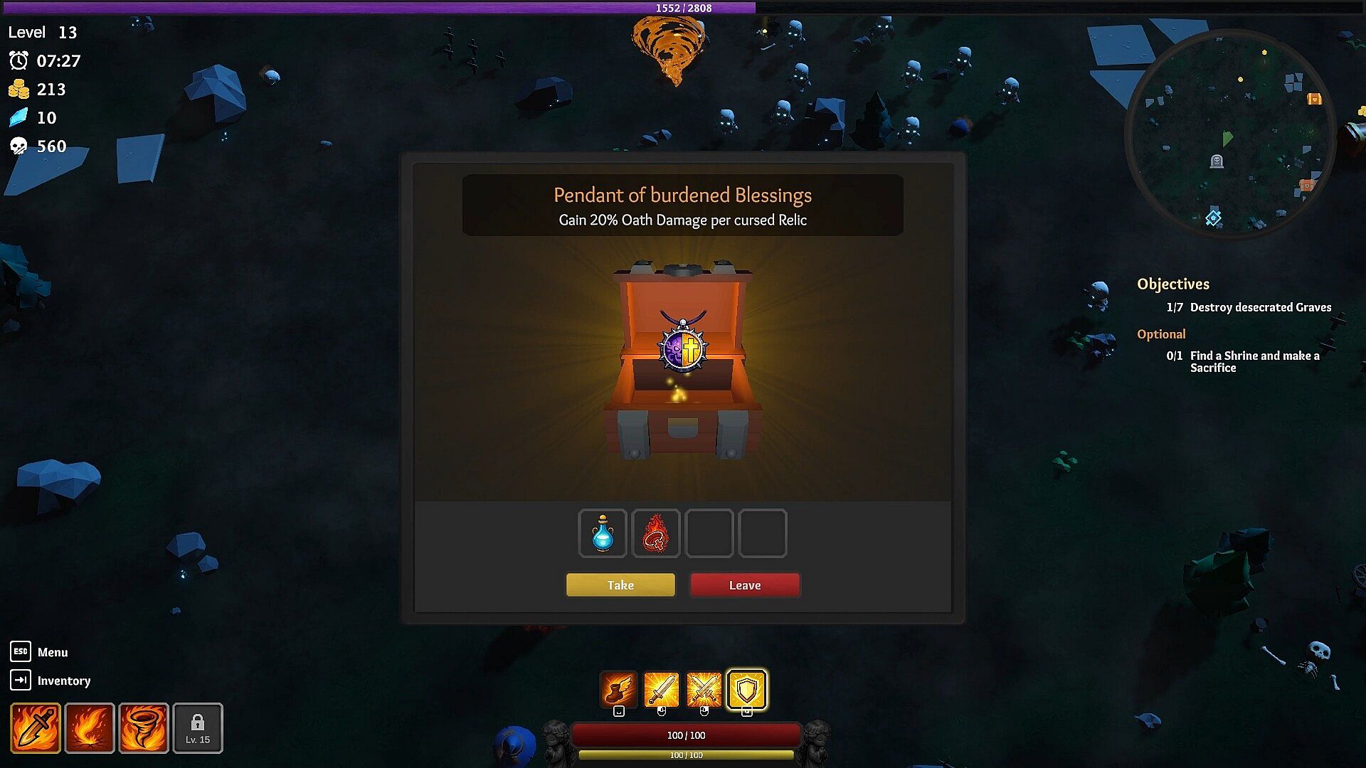 Open chests scattered across the map to discover ancient relics offering power and build variety, while cursed ones grant your their strength at a steep price, don’t let greed consume you.