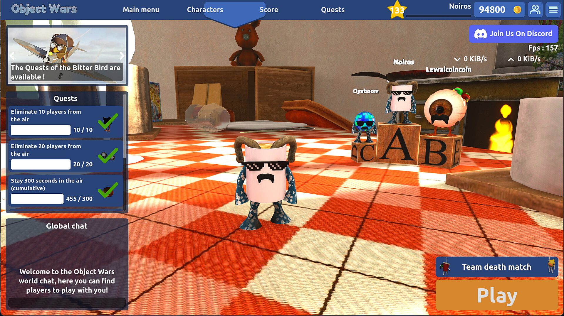 The adventure in Object Wars never stops! Season after season, the universe and its story expand with redesigned maps, an ever-crazier arsenal of weapons, and new objects. Every season is an invitation to rediscover the game in a new light! To top it all off, seasonal events like Halloween or winter holidays transform environments and add unique modes and objects.