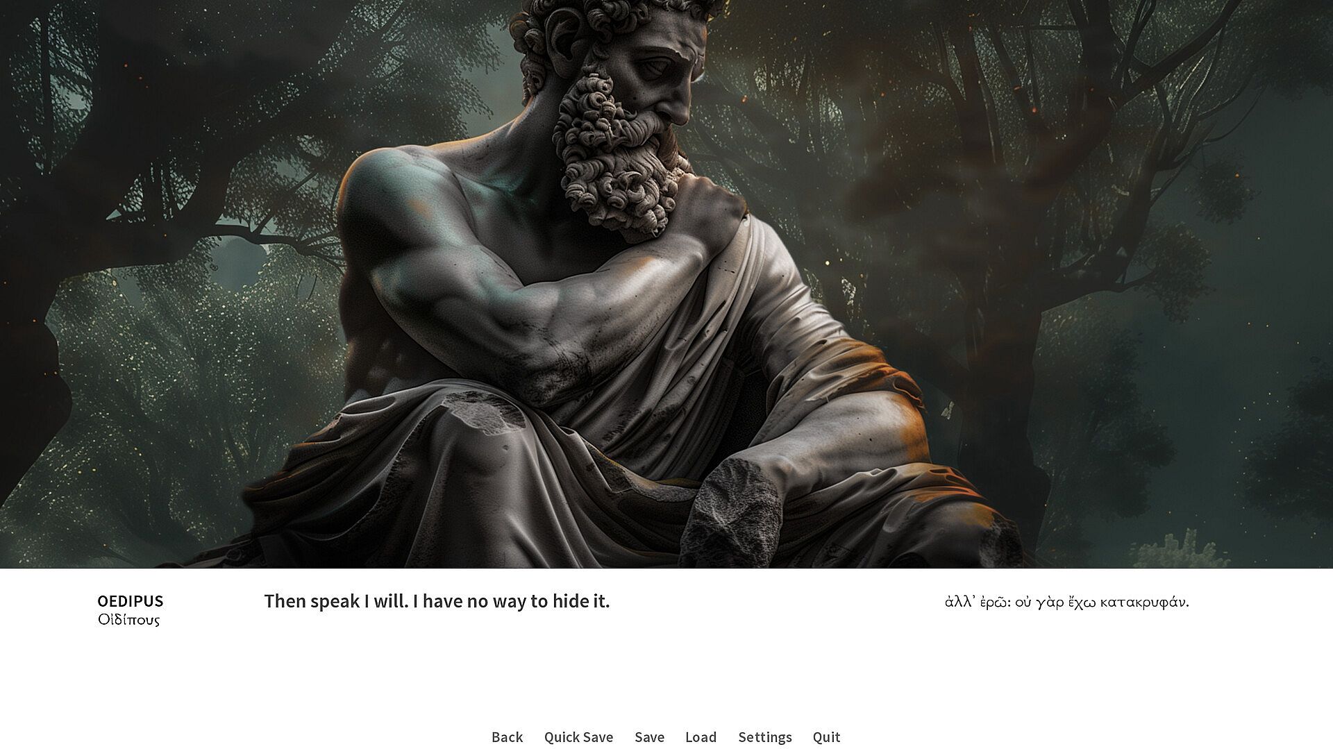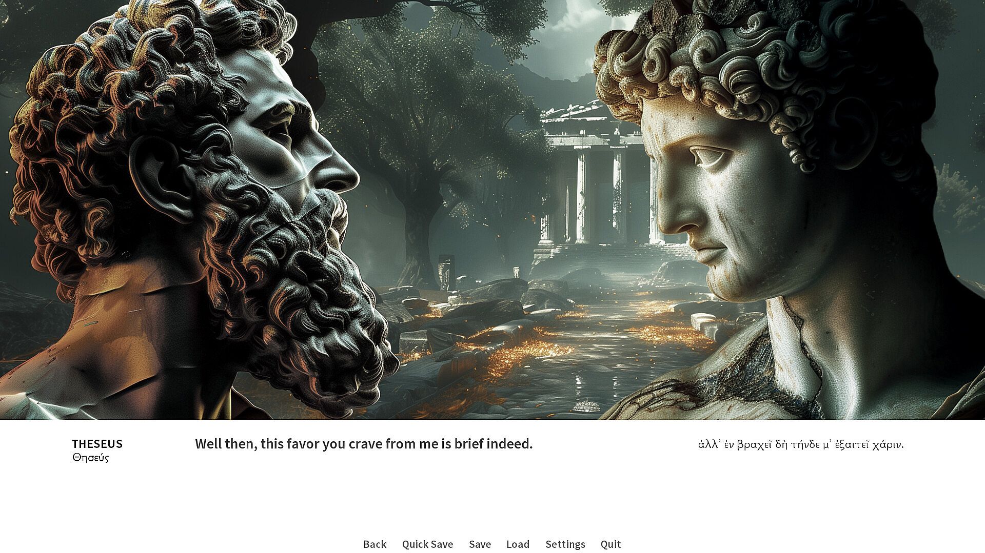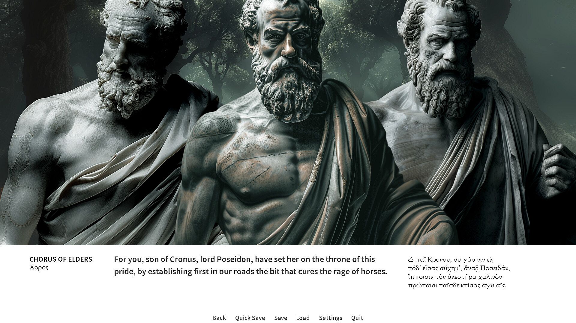 All of the characters in the game are represented as marble sculptures. Usually quite damaged sculptures. The sole developer of the Oedipus/Antigone project is perfectly aware of the fact that ancient statues were painted. And that actors in ancient theaters wore masks. The choice of this particular style was absolutely conscious and one of the main ideas was to evoke a certain feeling. This is pretty much how objects of material culture from classical antiquity came down to us. This is how we frequently perceive classical antiquity. And it has this flavor of the beauty of the broken things that fits the subject matter of these tragedies quite well.