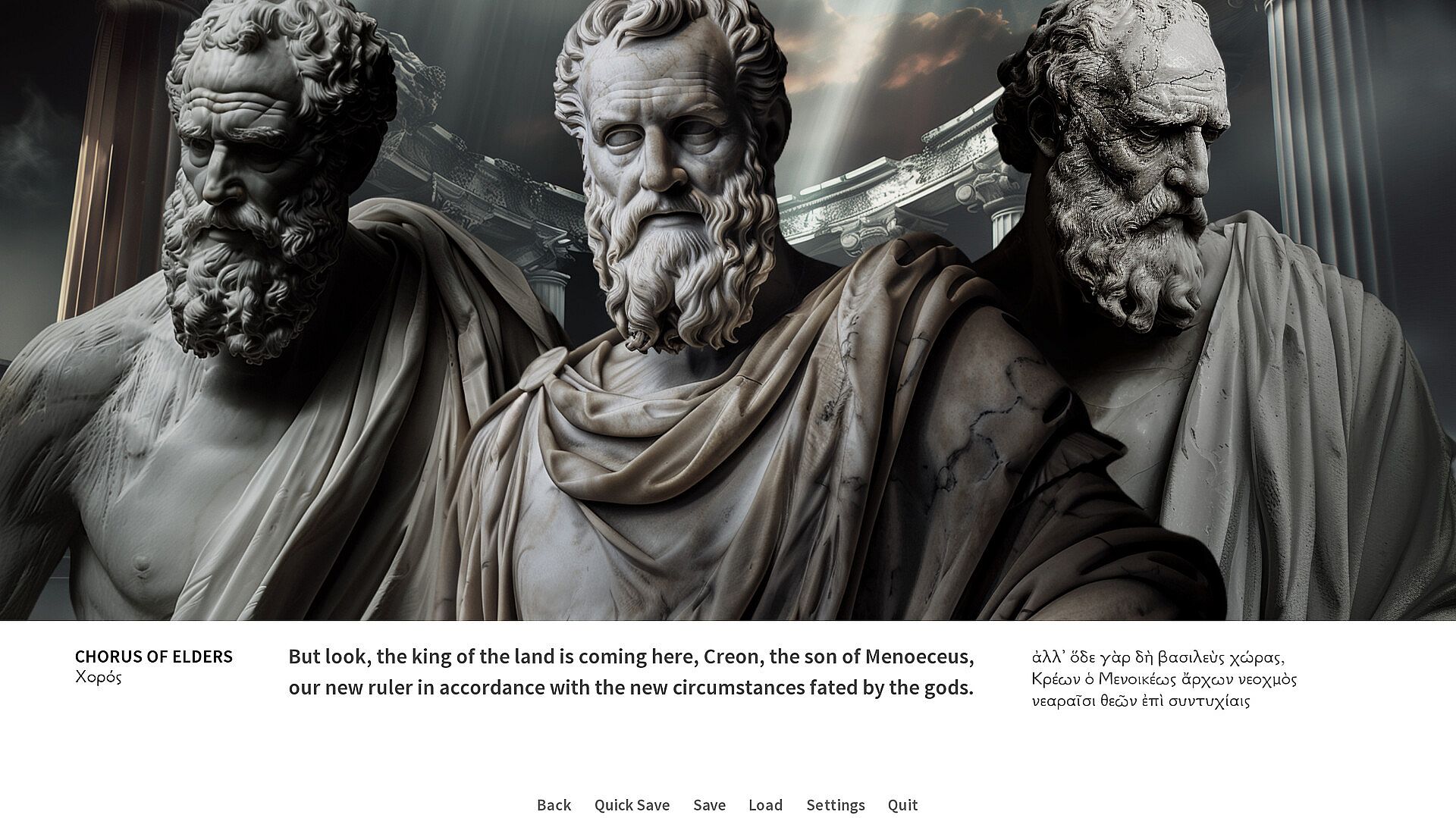 The Theban tragedies of Sophocles have been staged countless times and they will be staged and adapted over and over again as long as mankind exists. This interpretation of the Ancient Greek drama has a fairly obvious distinct feature: it takes the form of a visual novel.