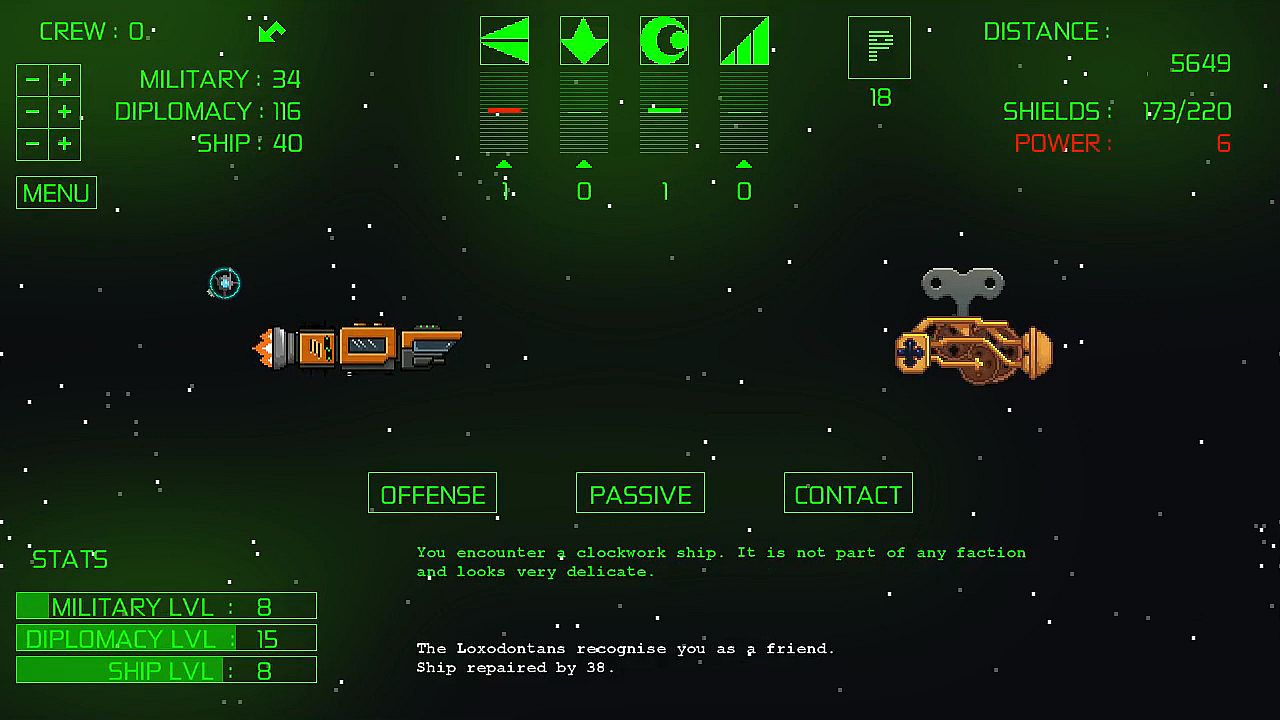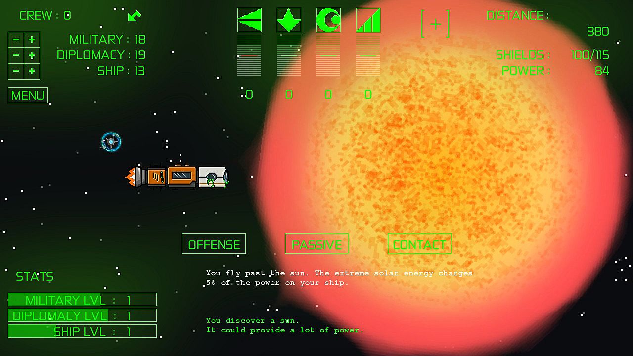 OESE is about your little ship, traveling alone through space trying to survive as best as it can to find a new home. Along the journey you come across different encounters with different outcomes depending on your decision. You can either try a passive approach if you're feeling peaceful, you can try to contact or trade with whatever oddity you've crossed paths with or you can go full offensive and fire a missile to try and steal their power!
