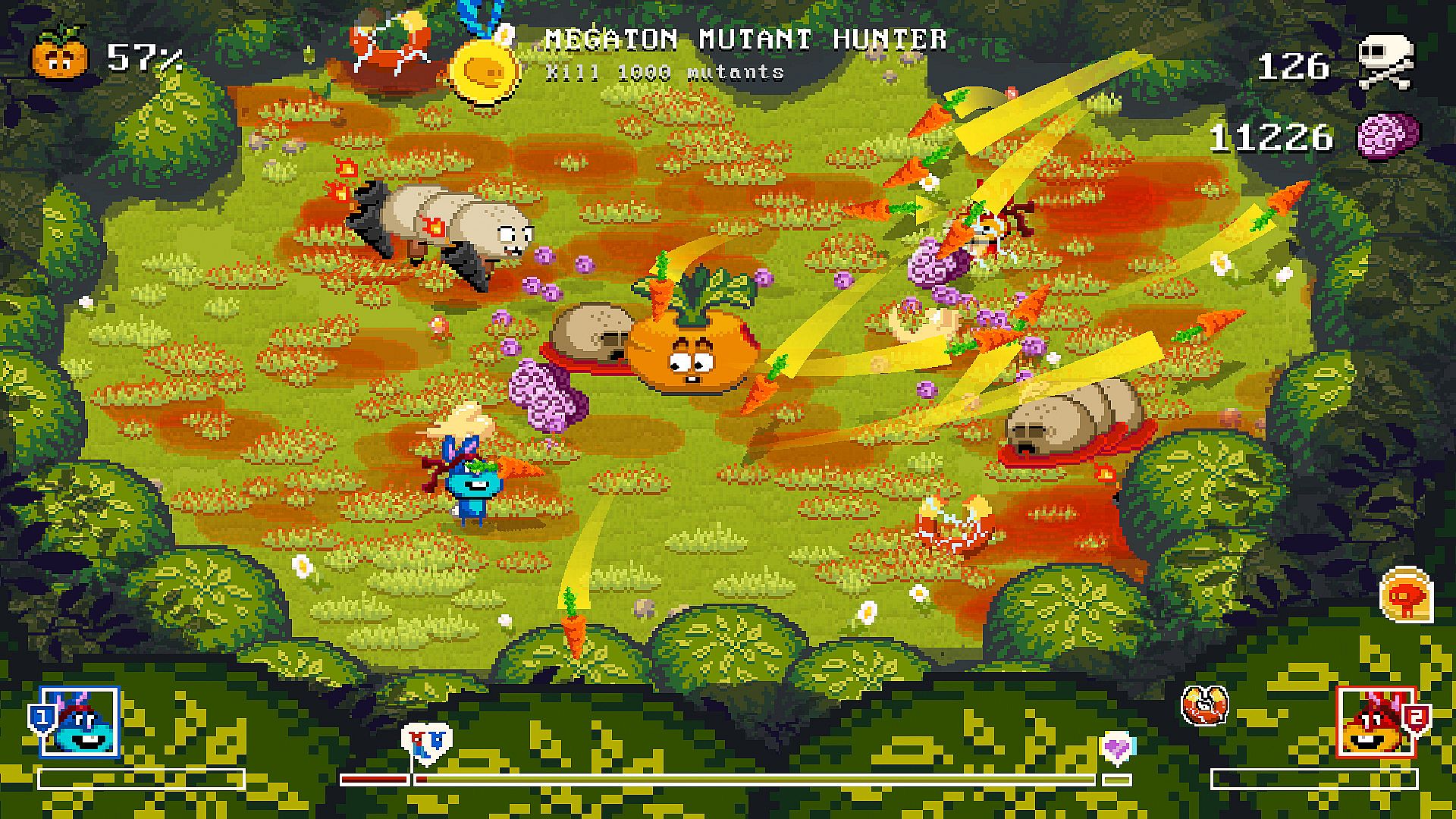 You will be thrown into a combination of old school arcade action, bullet hell chaos, cute retro pixel art and romantic love affair where the only thing that matters is to survive the never ending waves of mutants while defending a giant carrot and making out with your partner. Wait, what?! To release the tension during breaks, you can kiss your beloved bunny partner anytime in the game with the patented POWER KISS MECHANIC! You will need a steady hand and some mad skills to get on that high score list. Shoot your way through hordes of hungry mutants and saturate the forest floor with their gushing blood!