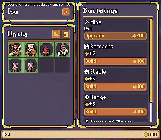 From the campaign map, you can select your territories to either command the armies on them or to upgrade and create various buildings used for producing gold and units. Upgrading financial buildings increases their gold yield, and upgrading military buildings increases the starting level of units produced with that building. Each faction has its own special building which, in addition to producing gold, can produce a unique special unit with varying abilities.When commanding your army to march on a territory you do not own, you will seize control if it is undefended or engage in a fierce battle with the defending army. In the battle map, you will prepare your units by strategically placing them on your side of the map. When both players are ready, you will take turns maneuvering the battlefield to eliminate all enemy units.