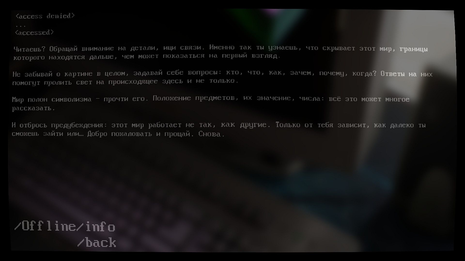 Offline is an unorthodox quest where the solution can be found in your mind and not on the screen. When the time comes, you'll understand.