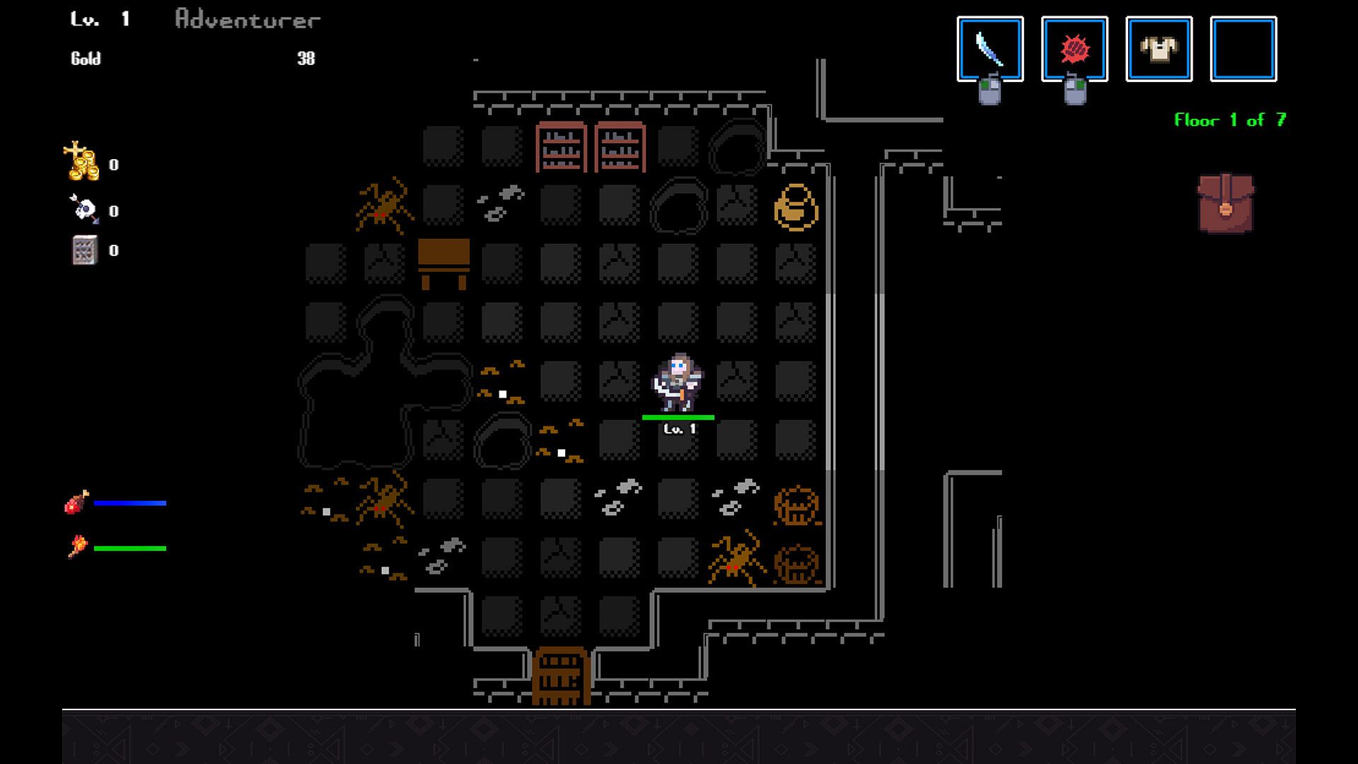 Currently, dungeon floors use an eclectic mix of hand crafting, semi-randomization, and procedural generation to help create unique experiences for each new game. However, this game is designed to be linear and is more focused towards pick-up-and-play, start to finish, rather than sandbox game play. This won't be a game you play forever. It is designed to be an experience that begins and ends, for the player's enjoyment, and then frees the player to move on. In this sense, both the game play and style are very retro. Almost arcade-like.