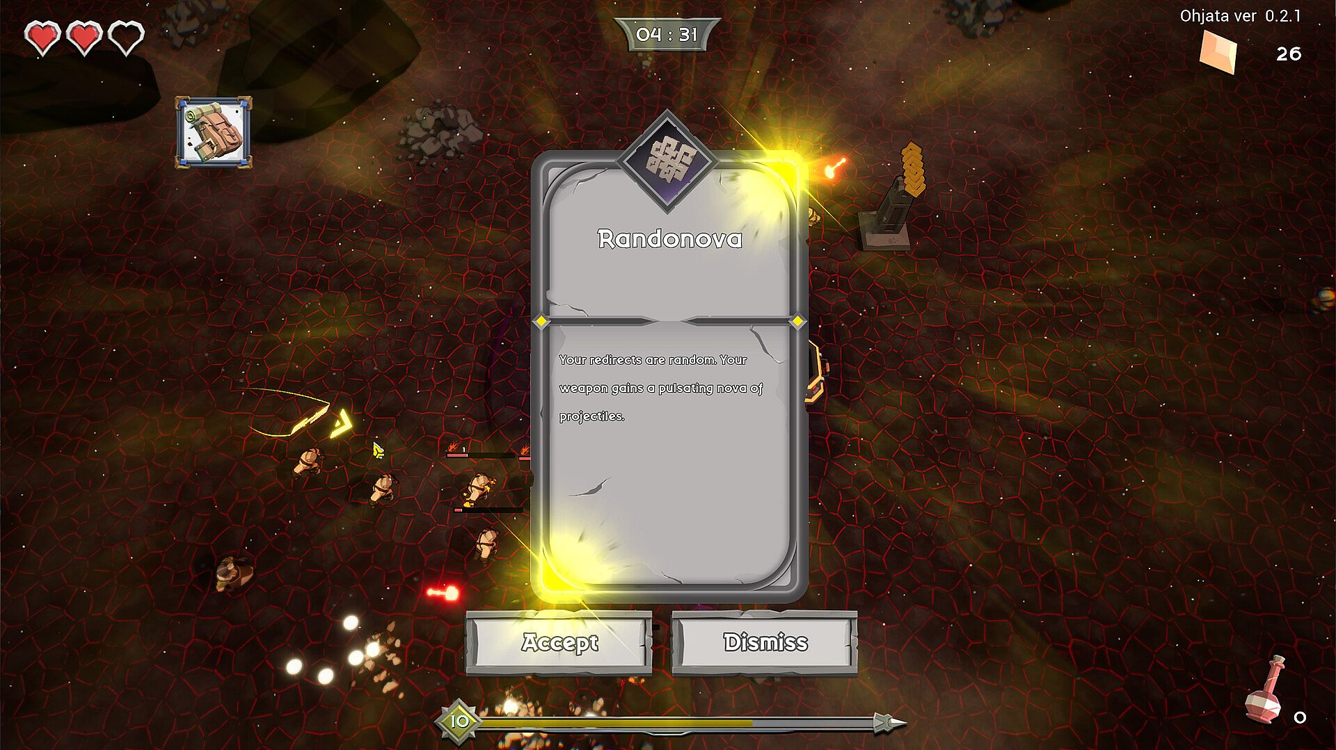 Ohjata redefines the survivors-like genre with skill-based challenges and rogue-like synergies at its core. Players master a unique redirect mechanic to send weapons at enemies, improving it through level-ups for more frequent use or faster movement. Hitting walls or losing projectiles off-screen triggers long reloads, demanding precision. Upgrades reshape runs with weapon enhancements, stat boosts, and build synergies, while random events drop relics and gems fund mods for future attempts. Death scatters gems for later collection, and deposit boxes let players secure them early. A hand-crafted volcanic map spans escalating eras filled with puzzles, lore, and secret bosses, perfect for indie action fans craving tough, replayable rogue-like depth.