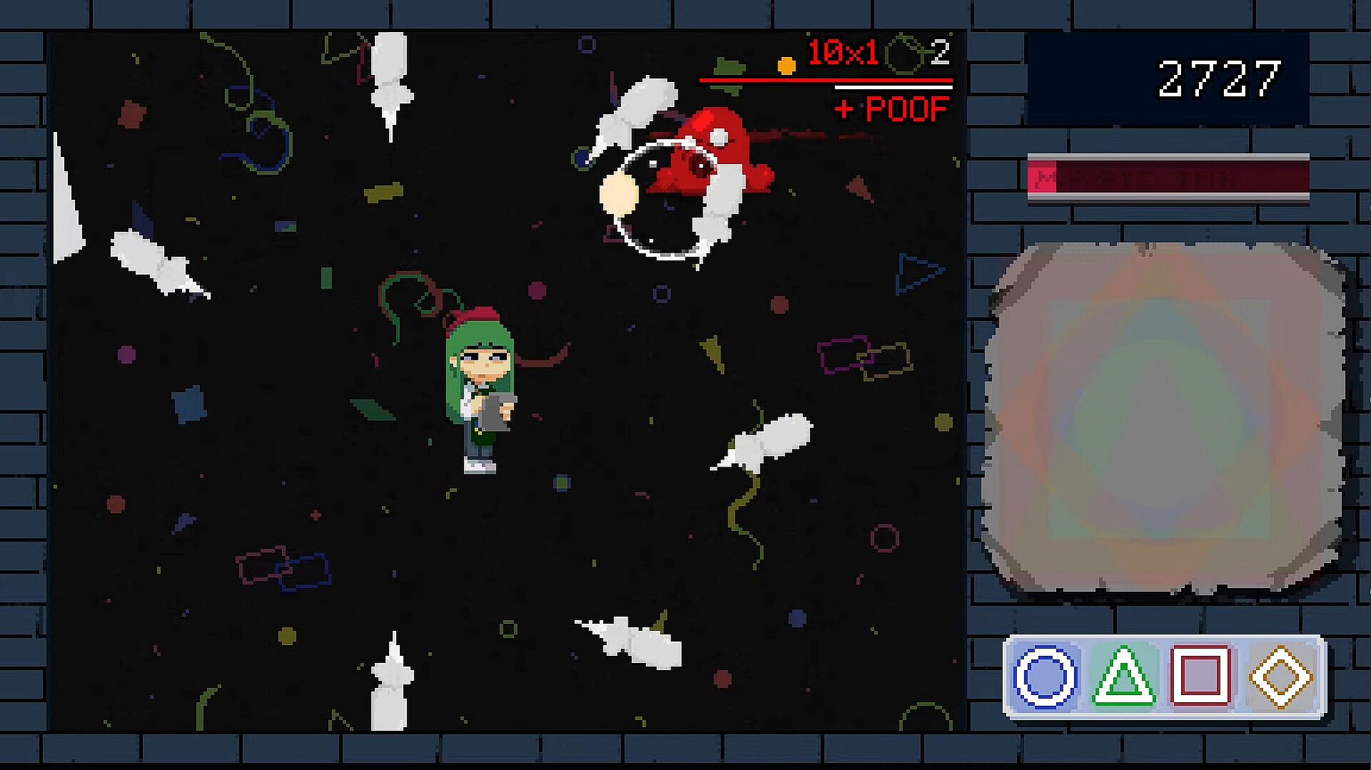 Tricked into entering the wizard's tower, she now must fight off waves of freakazoid art monsters so she can escape and claim her prize!