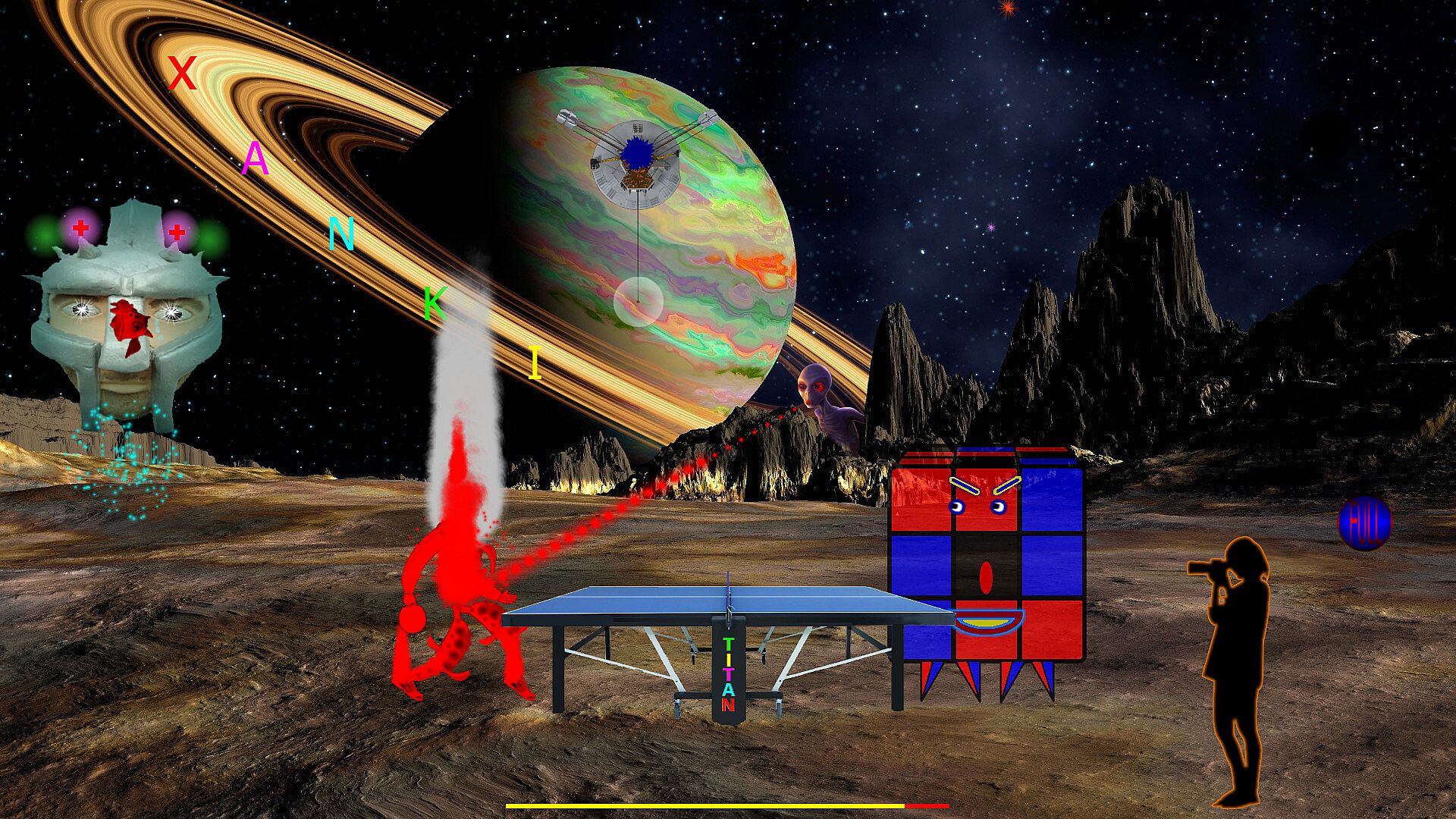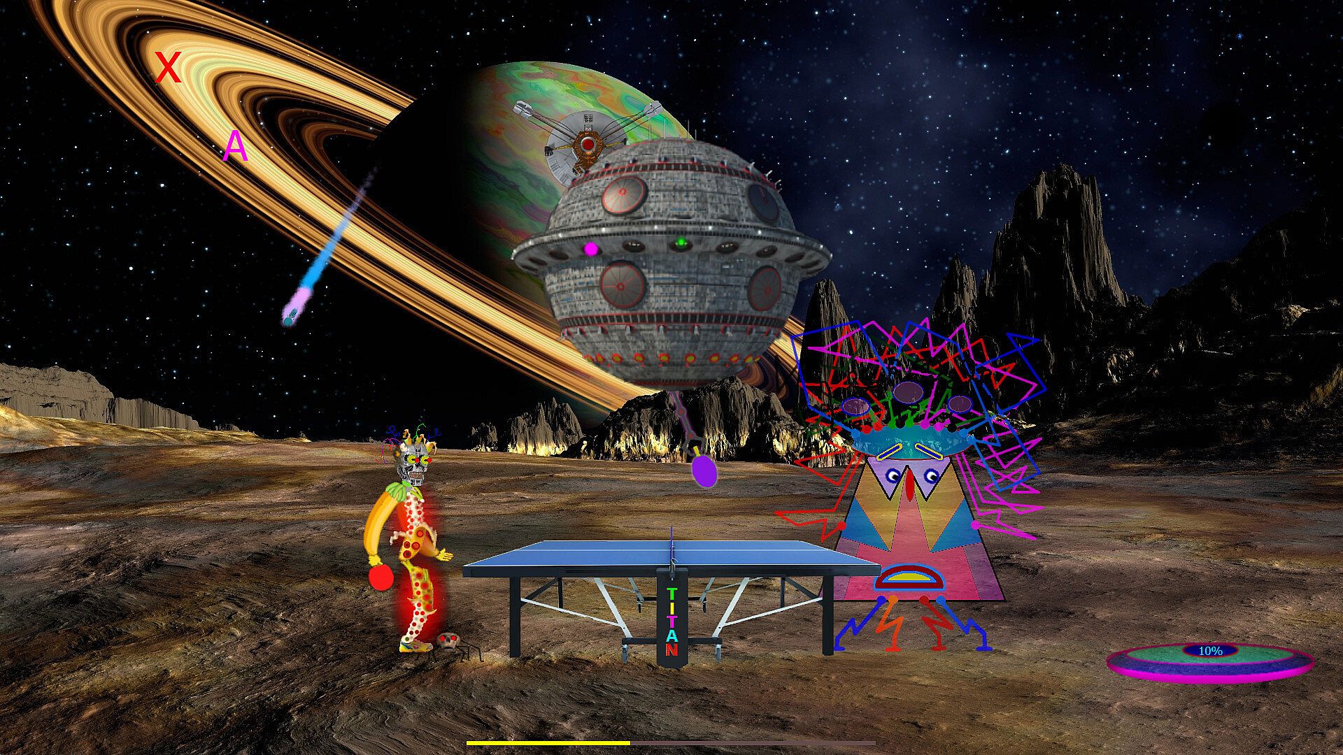 You have to win in six games. During the game, various alien creatures and objects randomly appear that interfere with the game. Some cause damage to your body. The crawling creatures try to bite off the legs. Flying dragons burn until they turn red. The blue sphere changes the trajectory of the ball. The paparazzi are constantly distracting and even throwing up the table. With each game, the power of the punches increases. The opponent also uses punches without rules, injuring your head and body. Between games, there is a musical respite with the opportunity to heal wounds.