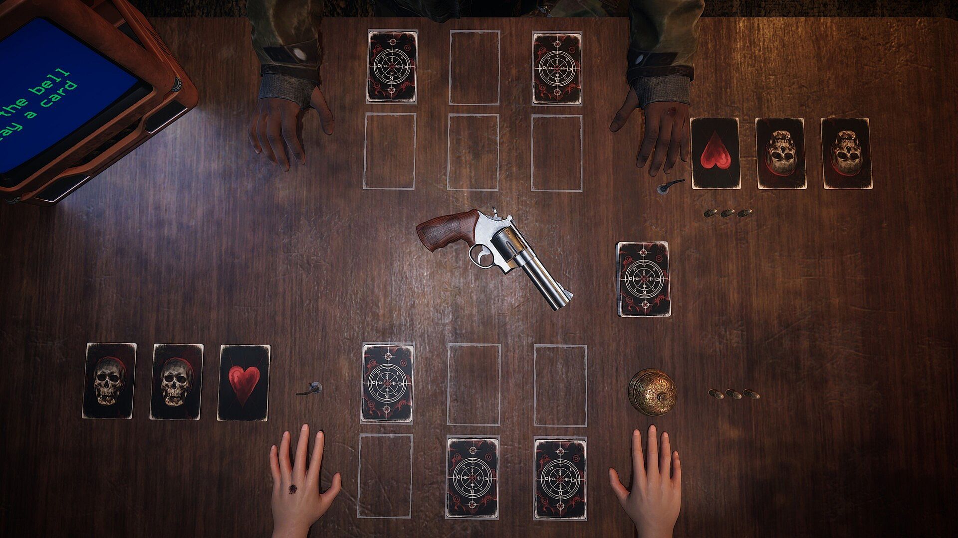 Shoot yourself to earn a powerful card or shoot your opponent and try to take one of their hearts.