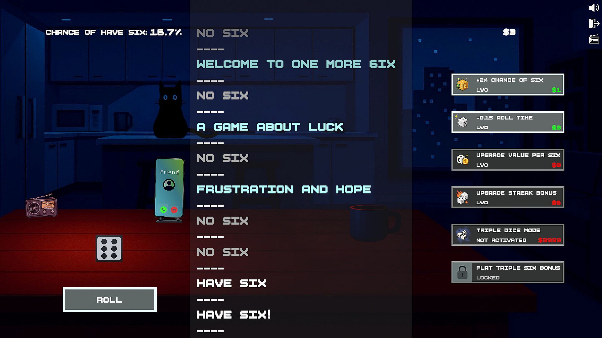 One More 6ixĀ is a short, minimalist clicker about rolling dice and chasing impossible streaks. Each roll start with a 1 in 6 (ā16.67%) chance to show a six. Getting nine in a row is roughly 1 in 10,077,696 possibility. As you play, small upgrades nudge your odds, quality of dice, or even try with three dice rolling at same time, but nothing guarantees success. The dice remember nothing while the cat on kitchen island keeps witnessing.