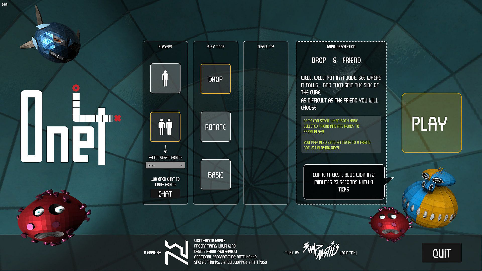 Compete against AI or Steam friends in this free-to-play indie strategy puzzle game set within a glass cube formation. Place characters to fill four cubes in a row and claim victory. Challenge yourself across three modes-Basic for direct placement, Drop with gravity pulls and slice spins, or Rotate without gravity-and tackle Easy, Medium, or Hard difficulties in single-player matches. Link up with Steam buddies via the friend dropdown or invite button to launch two-player battles, complete with in-game chat for mode selection. Strategy fans who enjoy precise placement and mode variety will find sharp matches here. PC players get quick sessions packed with tactical drops and spins.