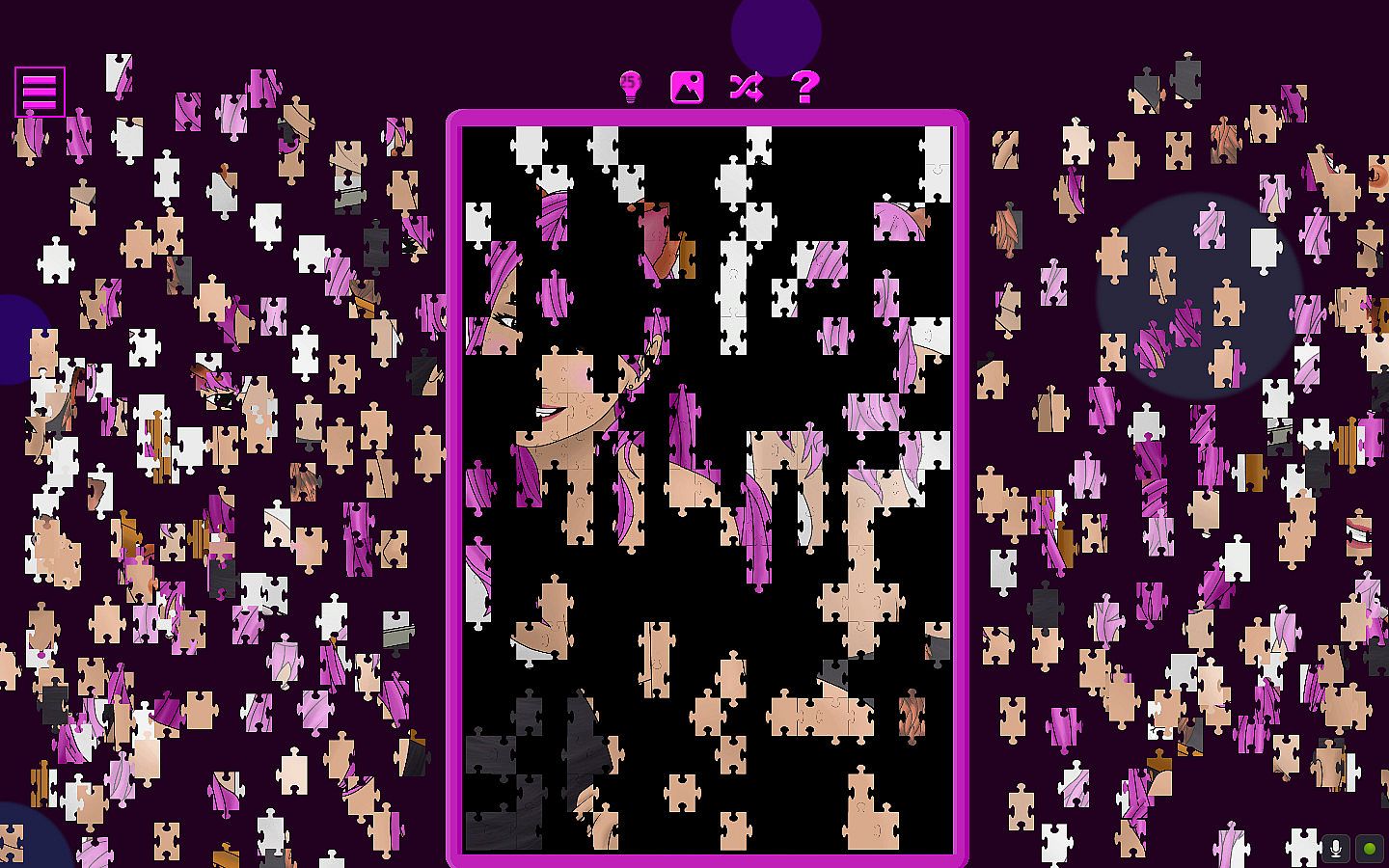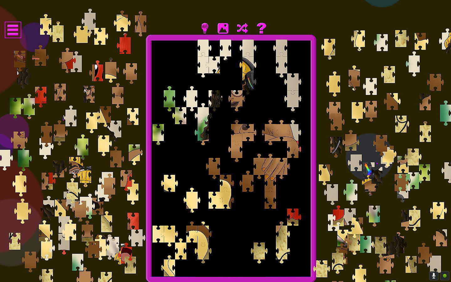 • Features include zooming in on the full scene, highlighting the puzzle's edge pieces, shuffling the remaining pieces, hinting.