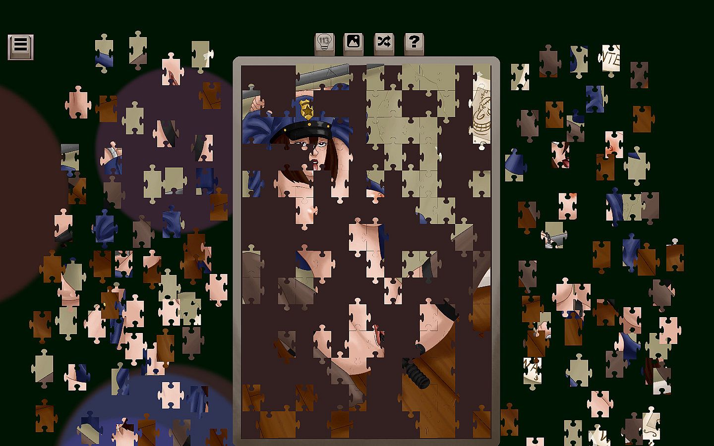 • Features include zooming in on the full scene, highlighting the puzzle's edge pieces, shuffling the remaining pieces, hinting.
