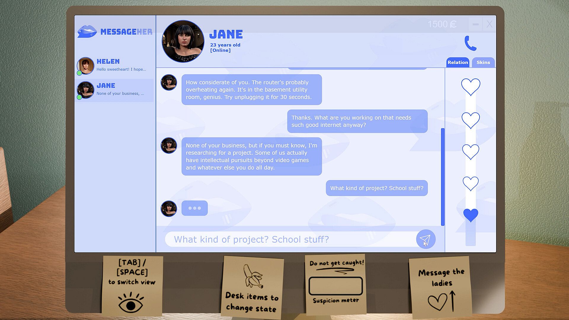 Suspicion Meter – Your lifeline. Get discovered too often and it’s game over. Manage risk to keep progressing deeper into relationships and content.