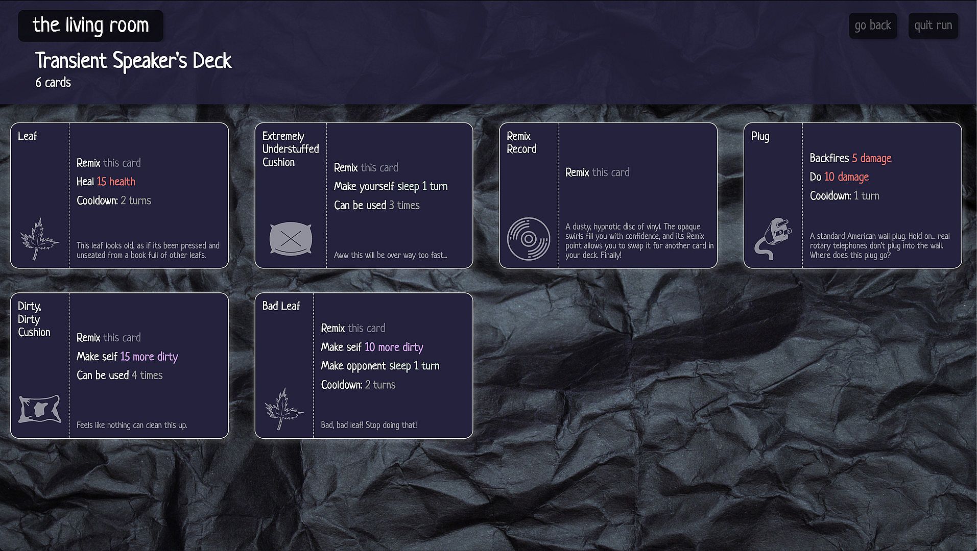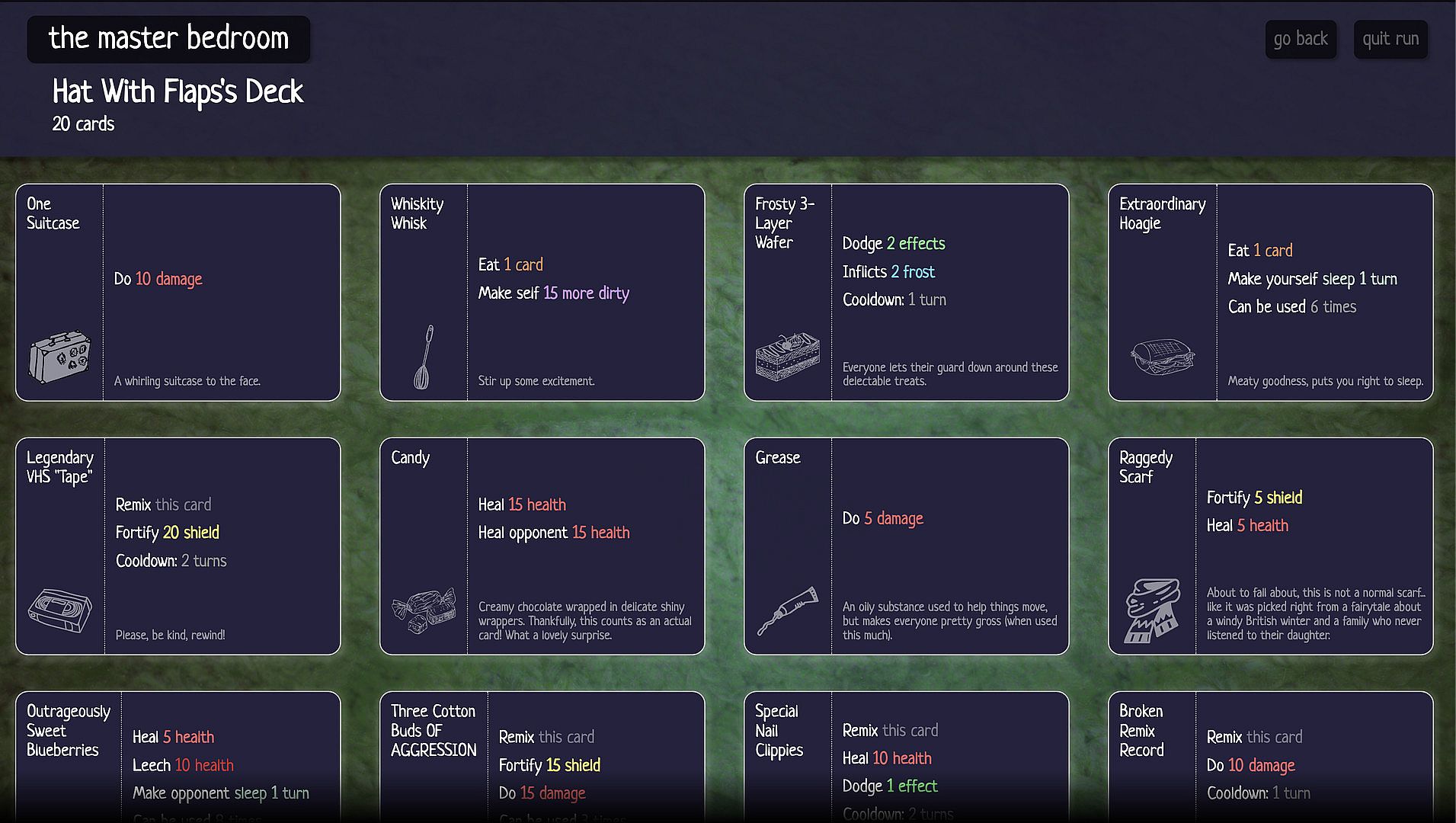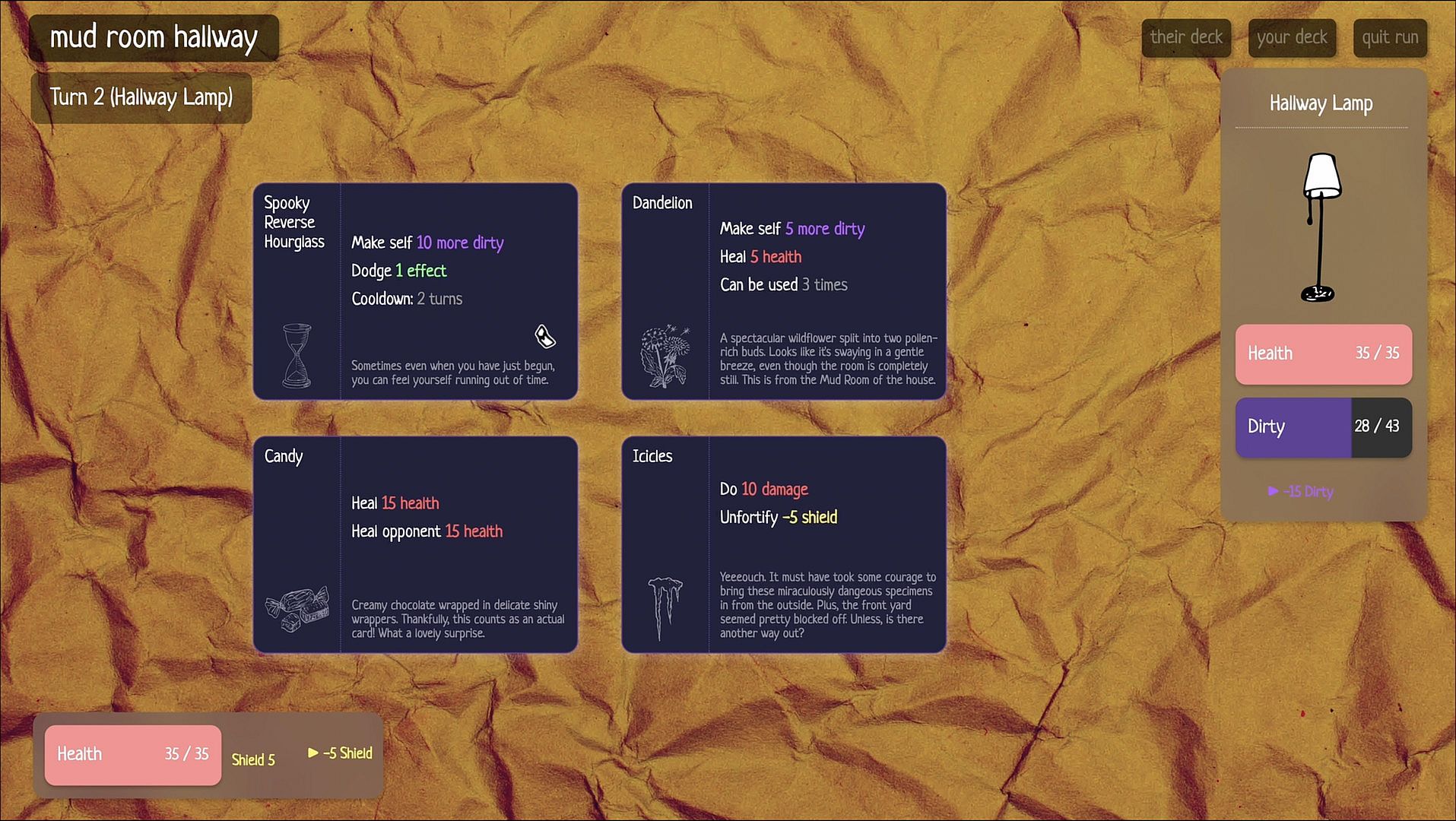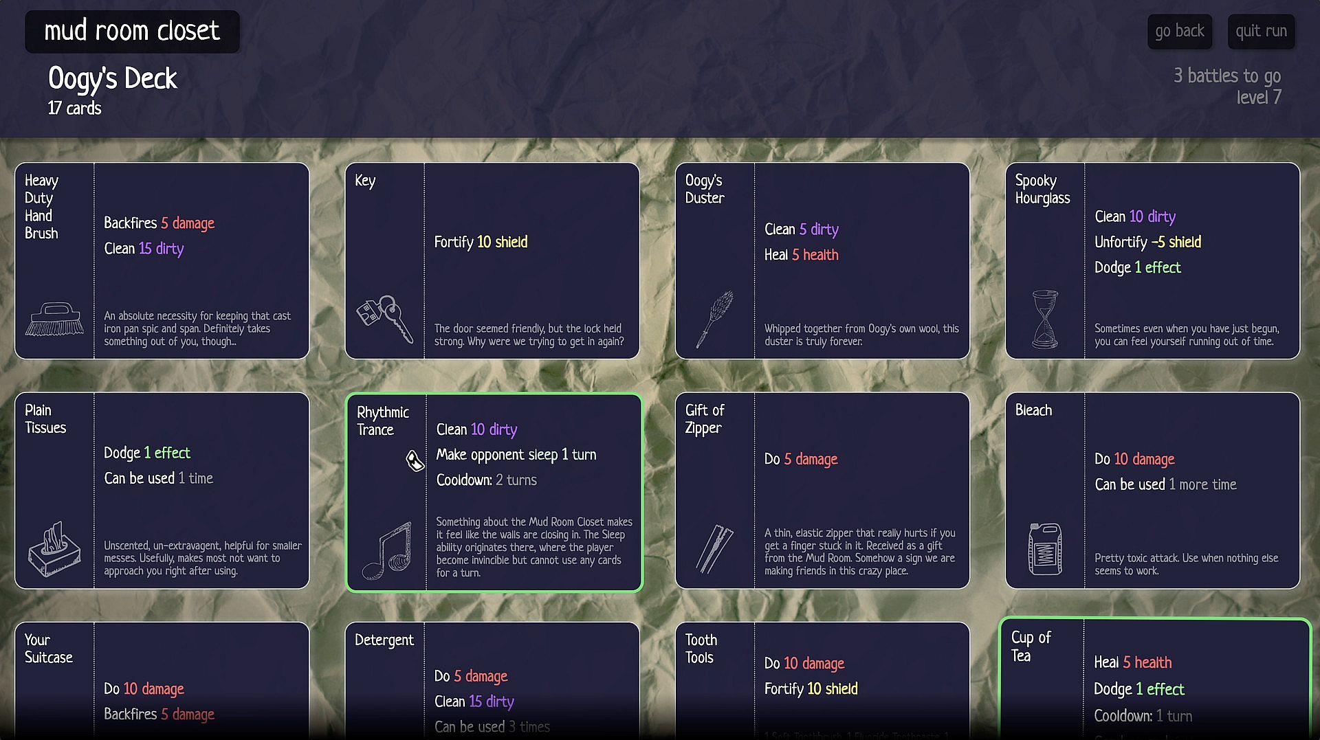 - Randomized decks for each opponent (after the Mud Room), with autosaving after every battle