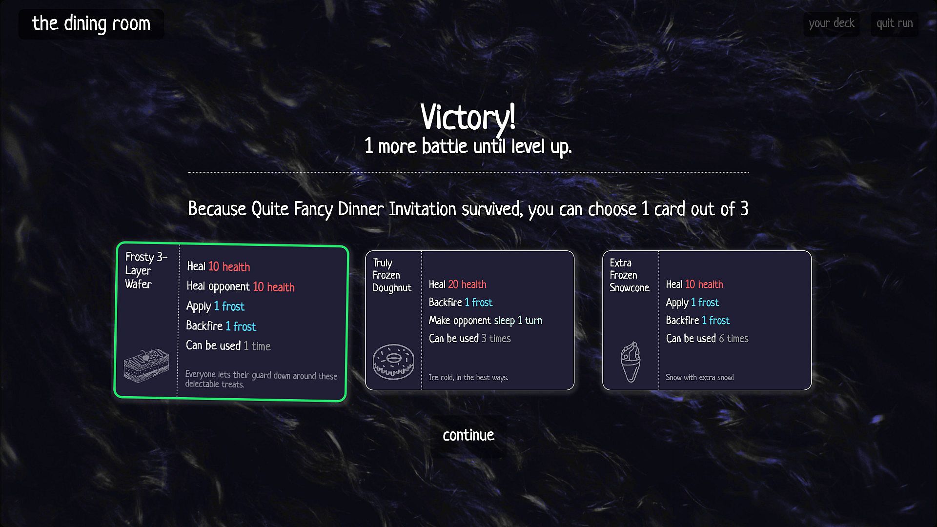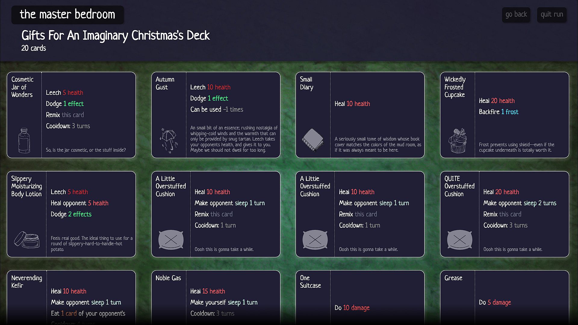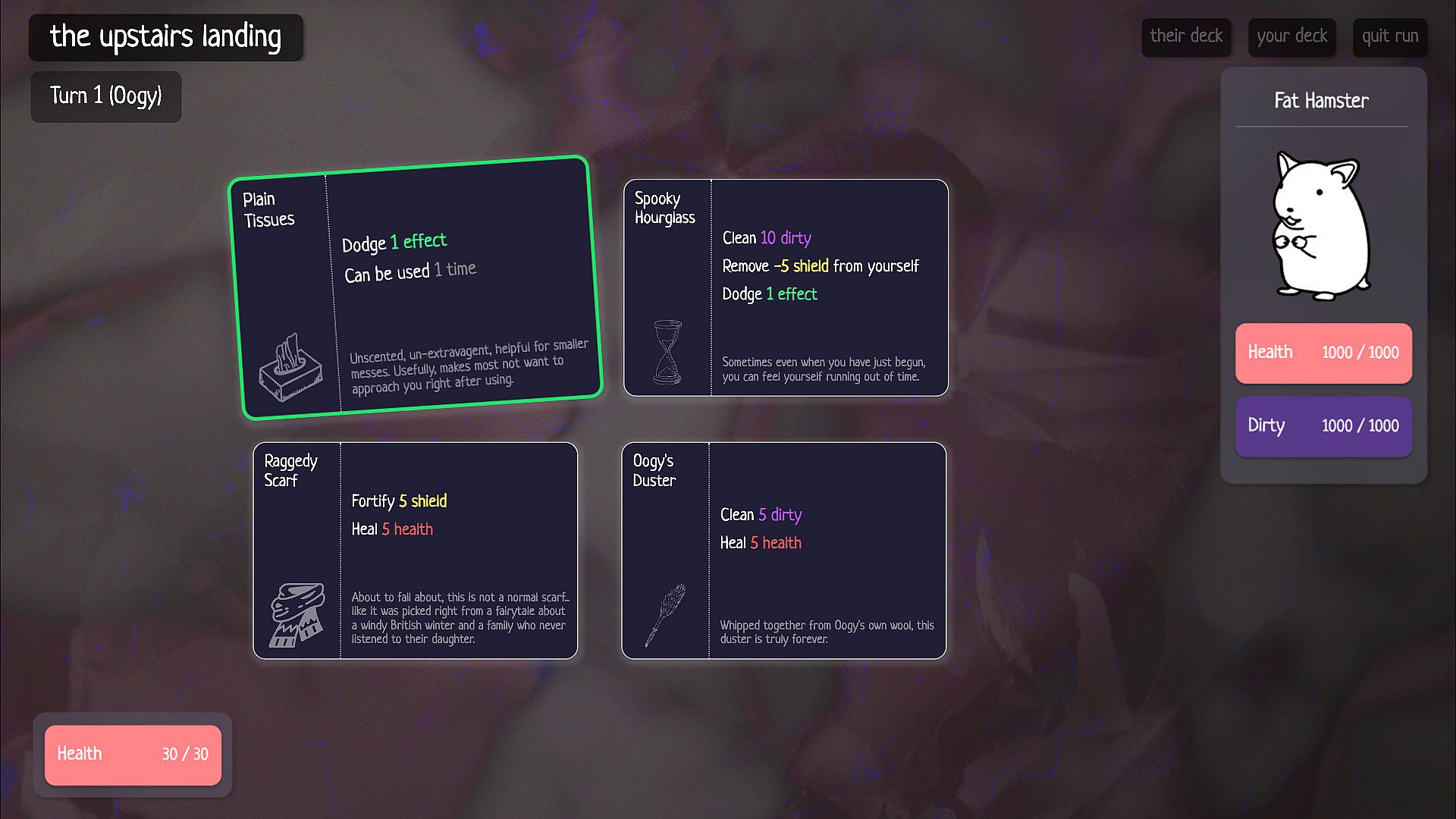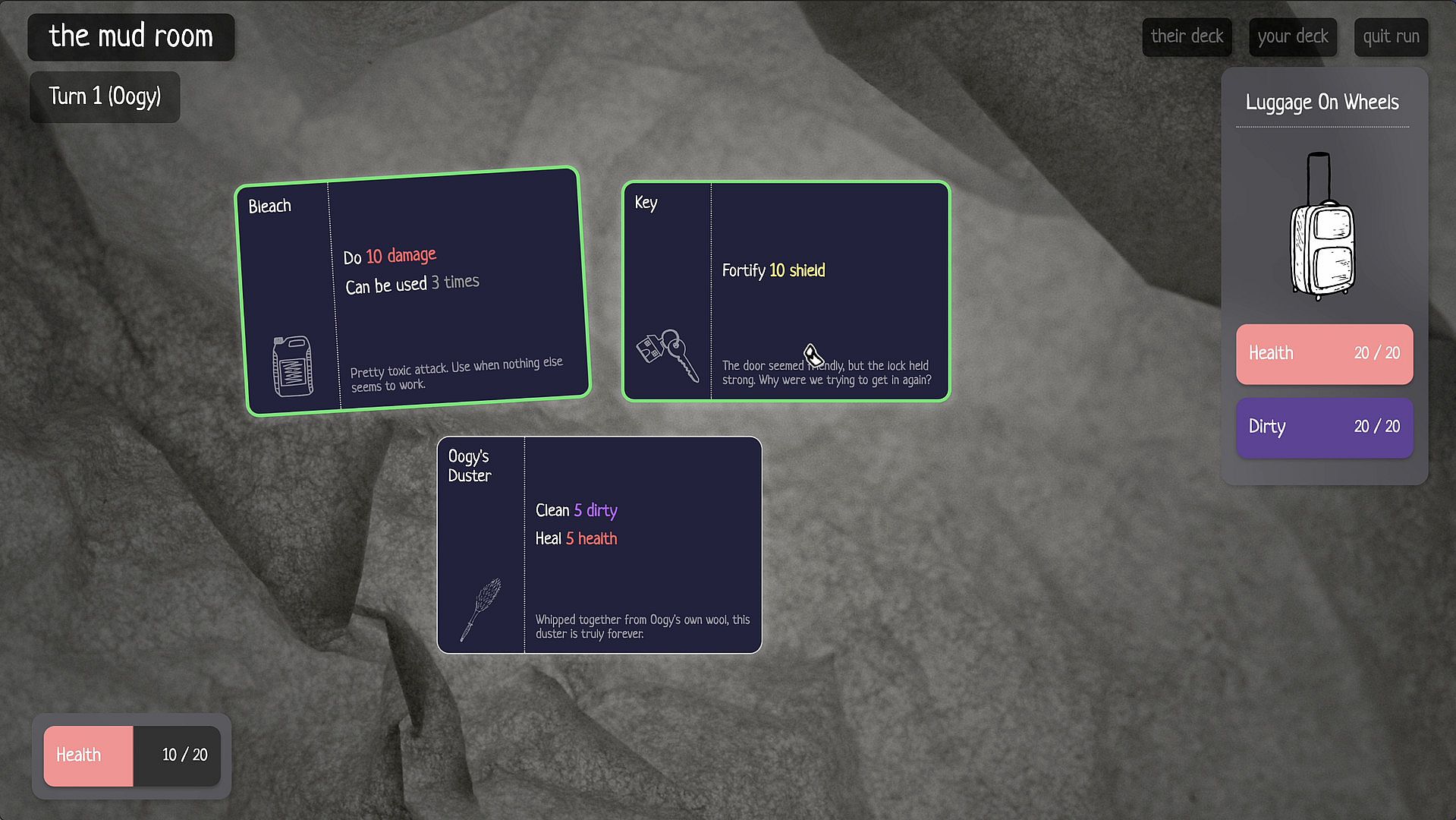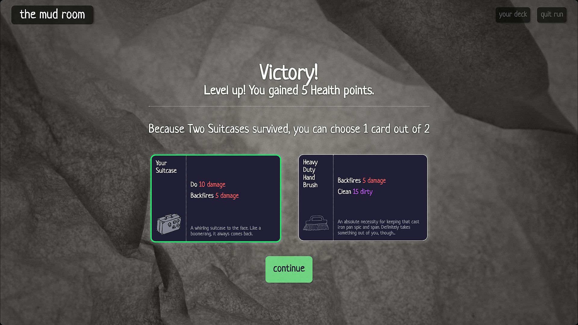- Randomized decks for each opponent (after the Mud Room), with autosaving after every battle