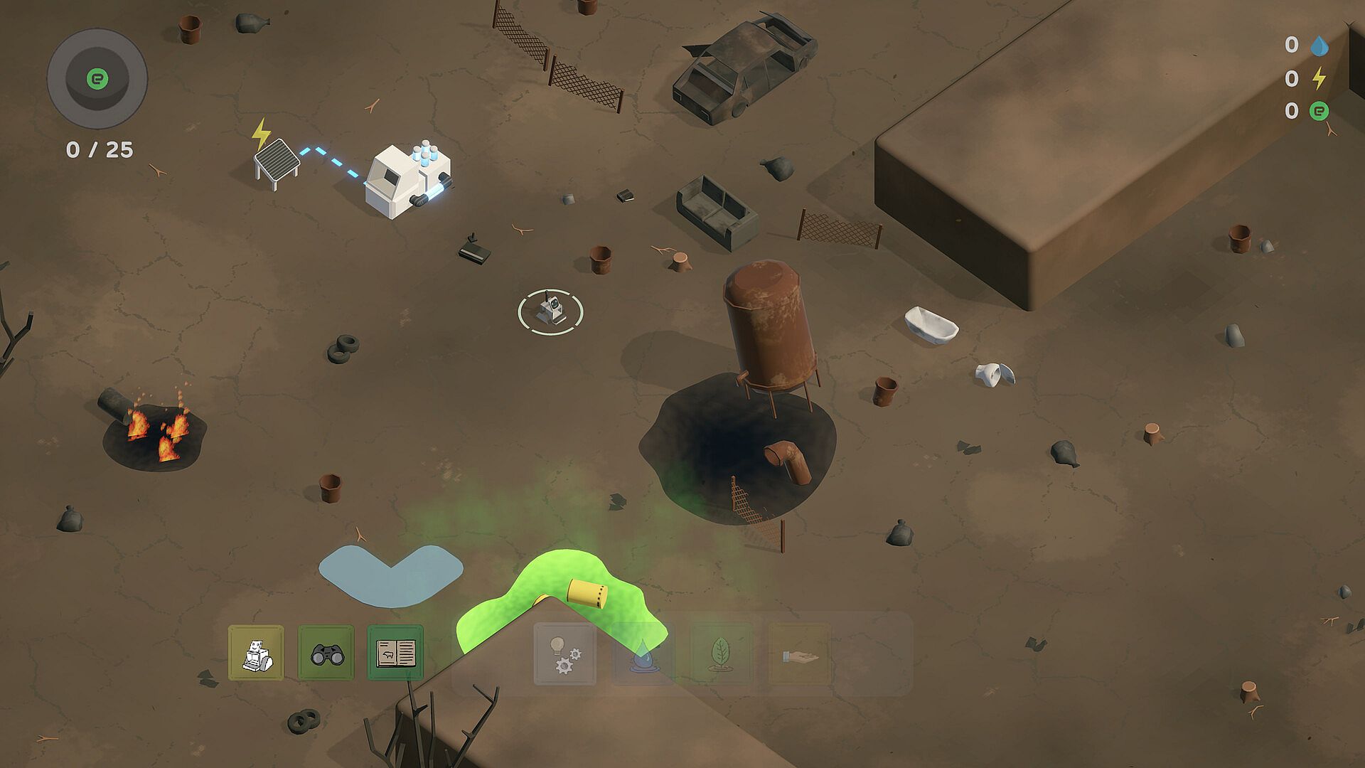 You begin in a damaged landscape filled with trash, oil, and scorched ground. With only a small eco-bot and a handful of tools, you start restoring the land one action at a time.