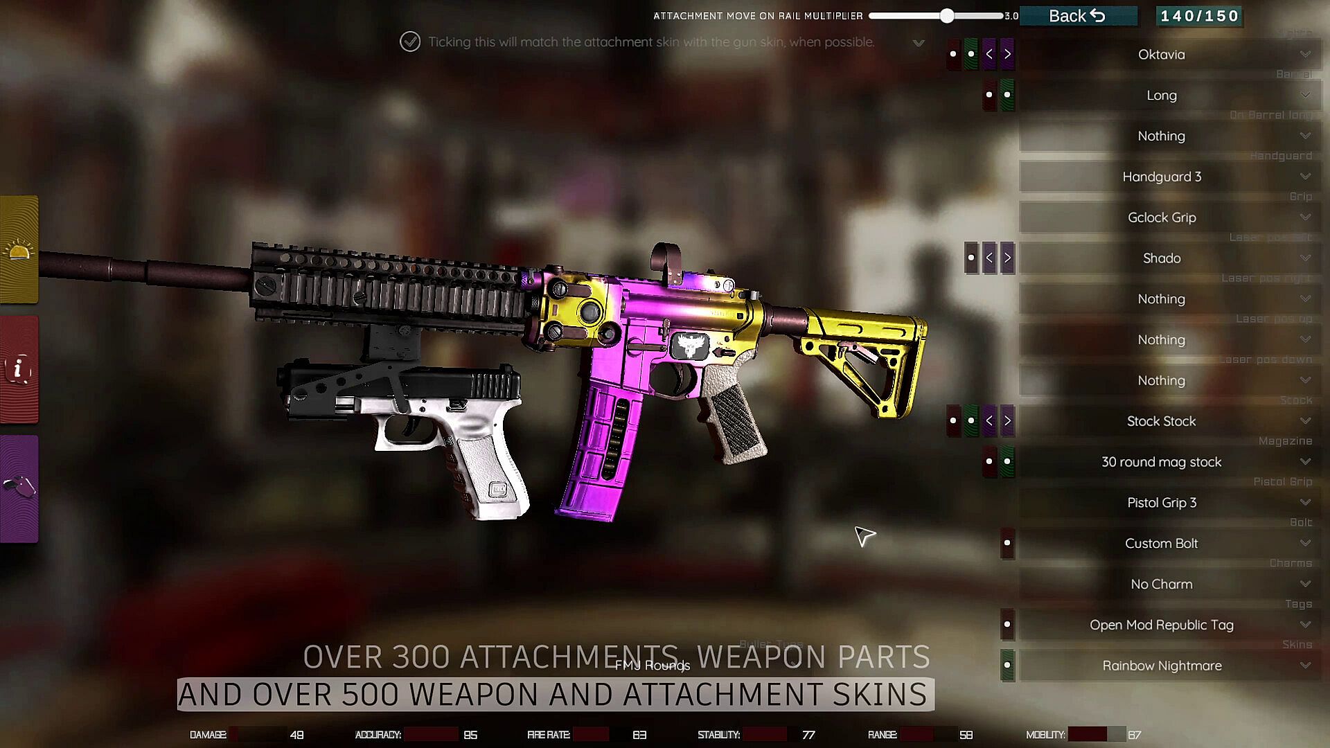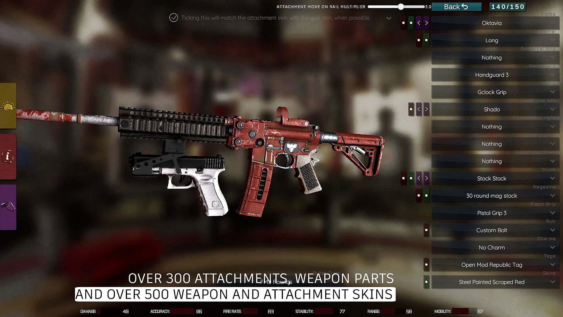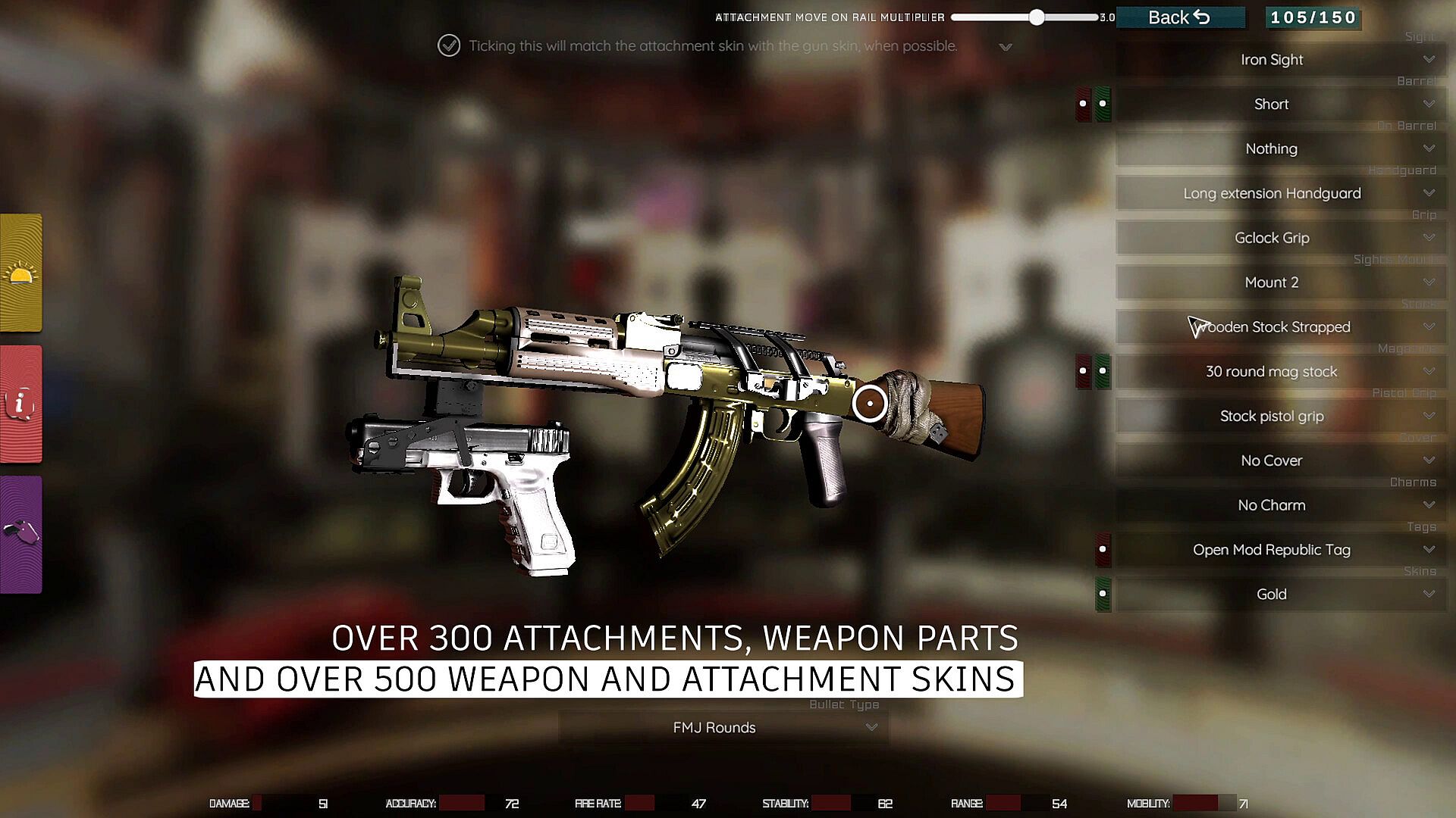 Open Mod has been built with scaling in mind, meaning that adding more content of all kinds into the game such as weapon skins, attachment skins, charms, tags, animations, even weaponery or custom maps, can be added in a matter of hours into the main game. Also our latest implementation of Unity's Addressables system allows us to have as much content into the game as we want, without having to load it all at the start of the game, but only when needed. With those said, we strongly believe we could add more content in time and at some point we could become the game with most customizability. We've already got 500+ skins available for a large variety of weapons and attachments, and 300+ attachments to choose from, plus individual weapon parts. Building content on top of this will eventually result in a highly populated with content game.