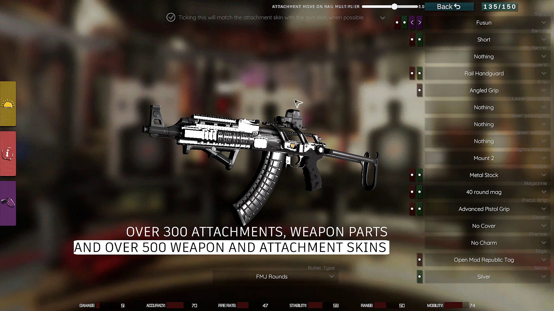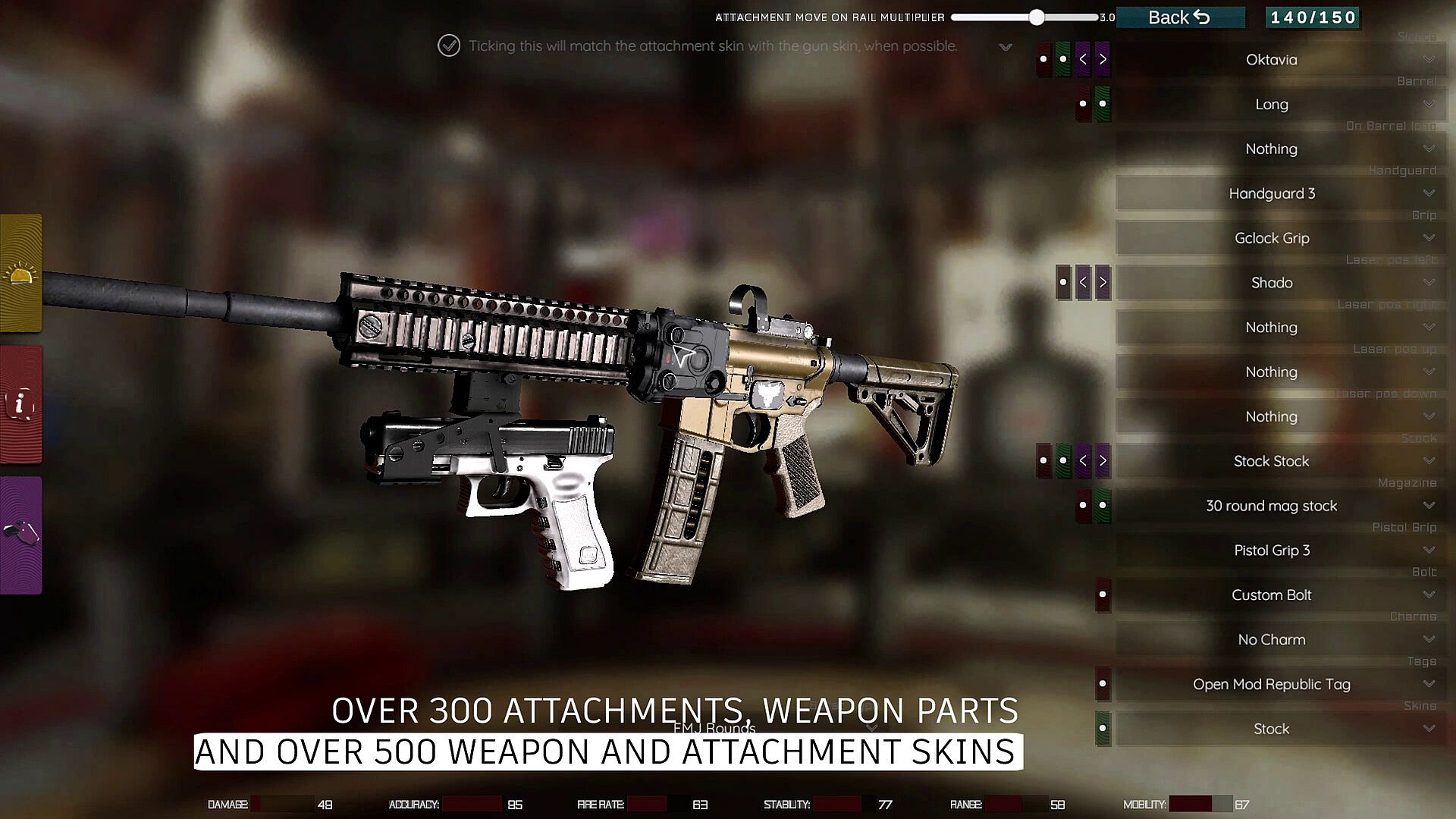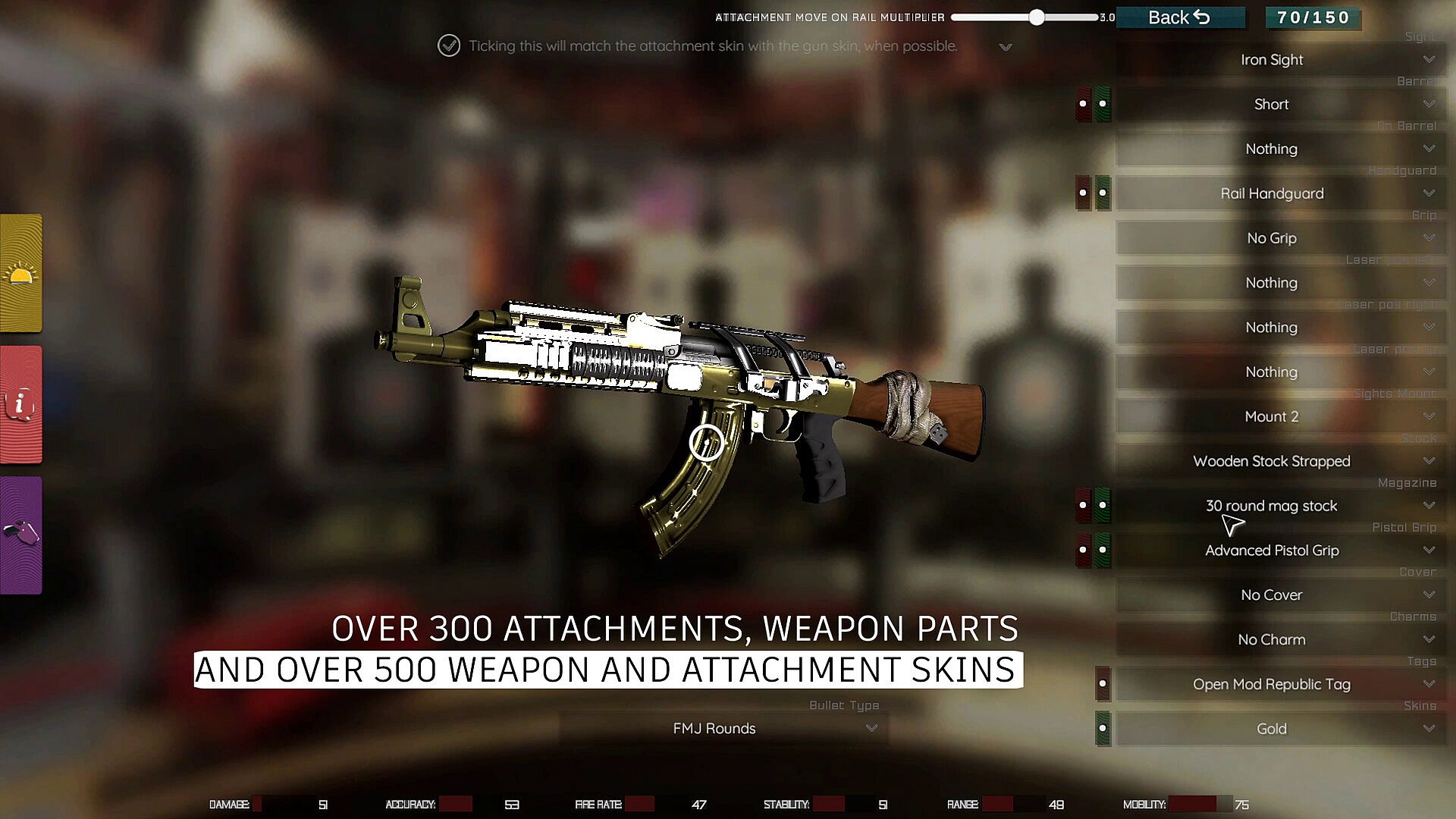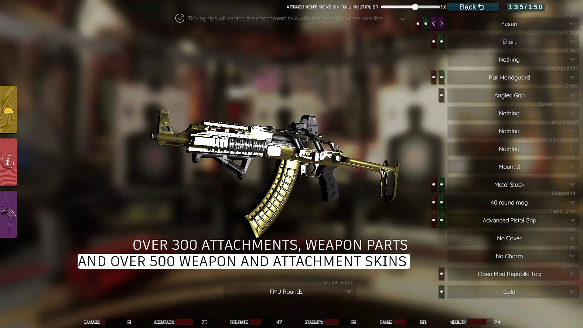 Open Mod has been built with scaling in mind, meaning that adding more content of all kinds into the game such as weapon skins, attachment skins, charms, tags, animations, even weaponery or custom maps, can be added in a matter of hours into the main game. Also our latest implementation of Unity's Addressables system allows us to have as much content into the game as we want, without having to load it all at the start of the game, but only when needed. With those said, we strongly believe we could add more content in time and at some point we could become the game with most customizability. We've already got 500+ skins available for a large variety of weapons and attachments, and 300+ attachments to choose from, plus individual weapon parts. Building content on top of this will eventually result in a highly populated with content game.