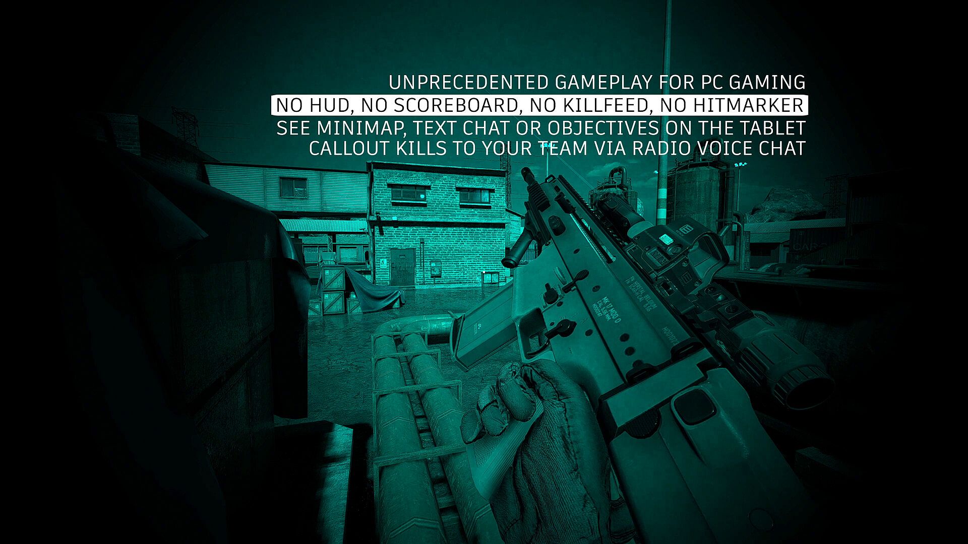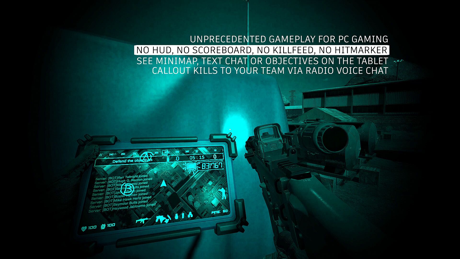 - There is no in-game HUD, we've moved everything except the crosshair to a tablet that is a core element of the game. The tablet will be used to check the minimap, text chat, see equipped loadout, see objectives etc. There is much to say about it but to save you the reading of a lot of words you can simply check THIS short video which shows an overview of the tablet.
