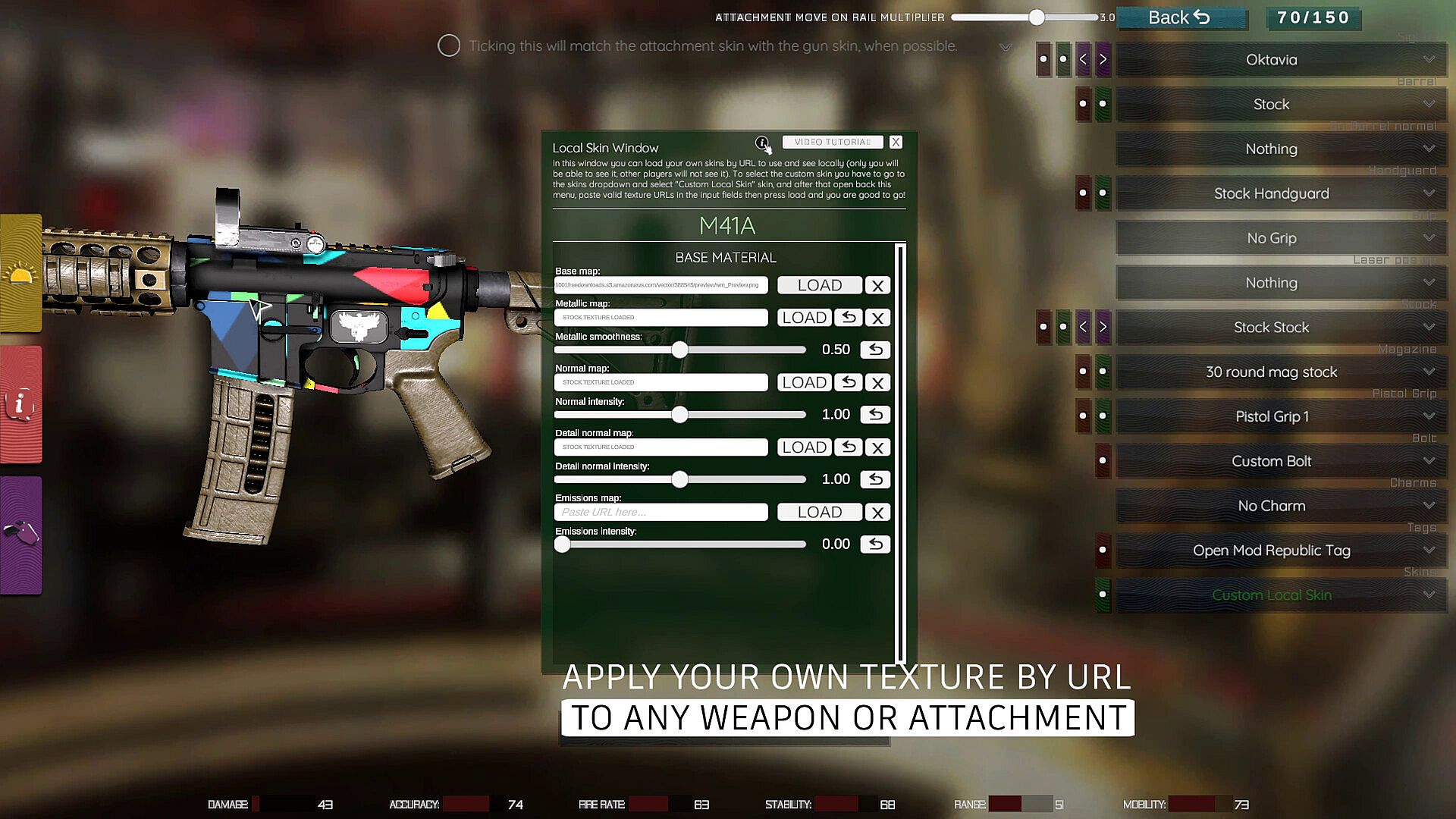 -custom local skin system, unprecedented in any fps game, this system allows you to load textures in the game by URL for any weapon and any attachment! Video HERE