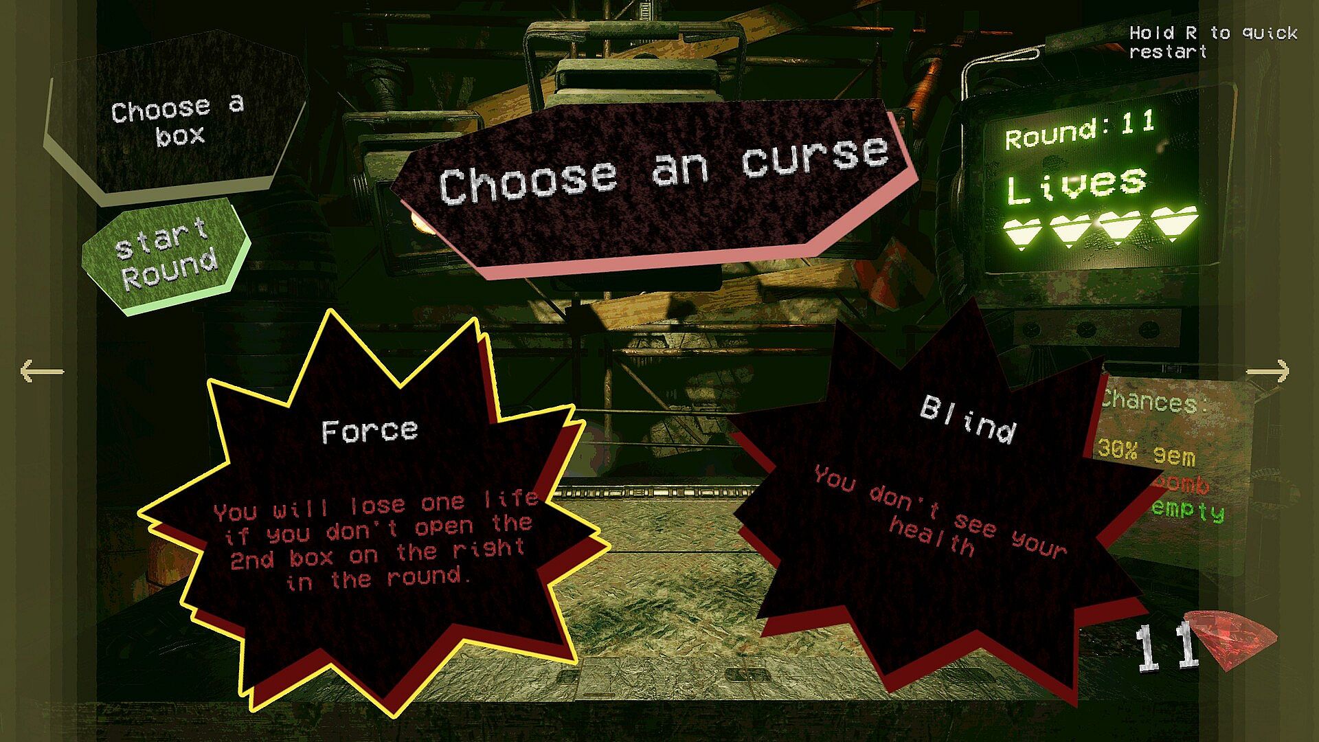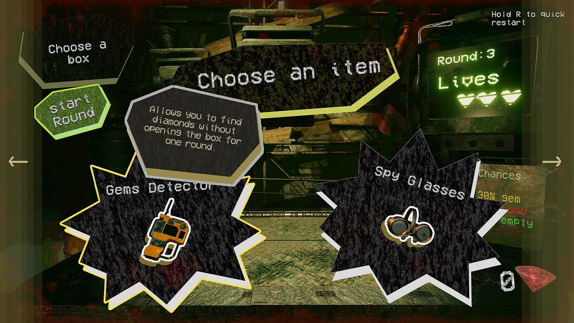 You have entered a deadly show from which you can only escape as a winner. You are offered boxes and told to choose and open any number of them. You do not know what is inside each box, except for the odds of winning. If you're lucky, you will find diamonds in the boxes, which you can then spend on meta-upgrades that will allow you to change the odds and tilt the balance of the game in your favor. You can also acquire useful items, each of which will help influence the game in different ways, giving you a chance to outsmart the organizers of this insane show. The game is a simplified roguelike where, upon losing all your lives, you start over after death with new items and upgrade possibilities.